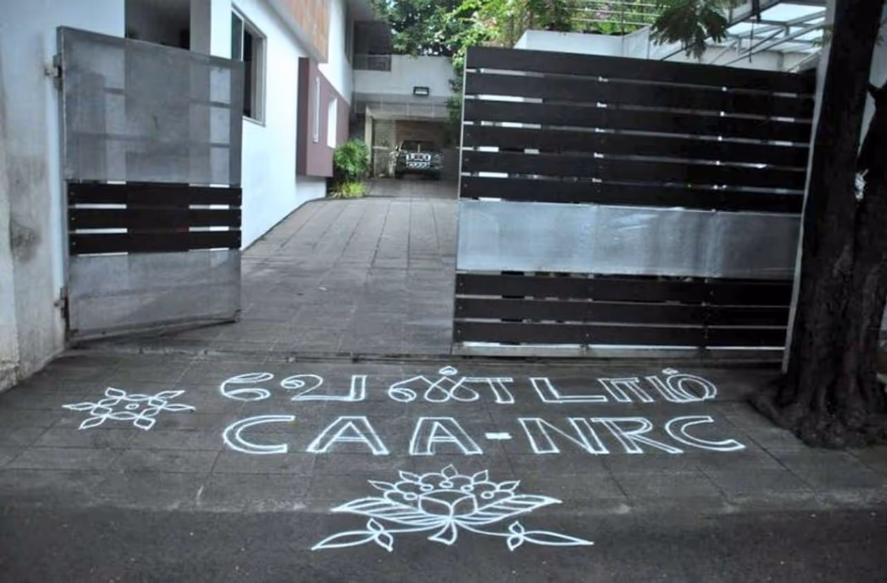 இதனிடையே சென்னை ஆழ்வார்ப்பேட்டையில் உள்ள ஸ்டாலின், கோபாலபுரத்தில் உள்ள கருணாநிதி வீடு, சி.ஐ.டி., காலனியில் உள்ள கனிமொழி வீட்டில்கோலம் போடப்பட்டுள்ளது. வேண்டாம் CAA, NRC என்றும், அருகில் சில பூக்களும் கோலத்தில் இடம் பெற்றிருந்தது.