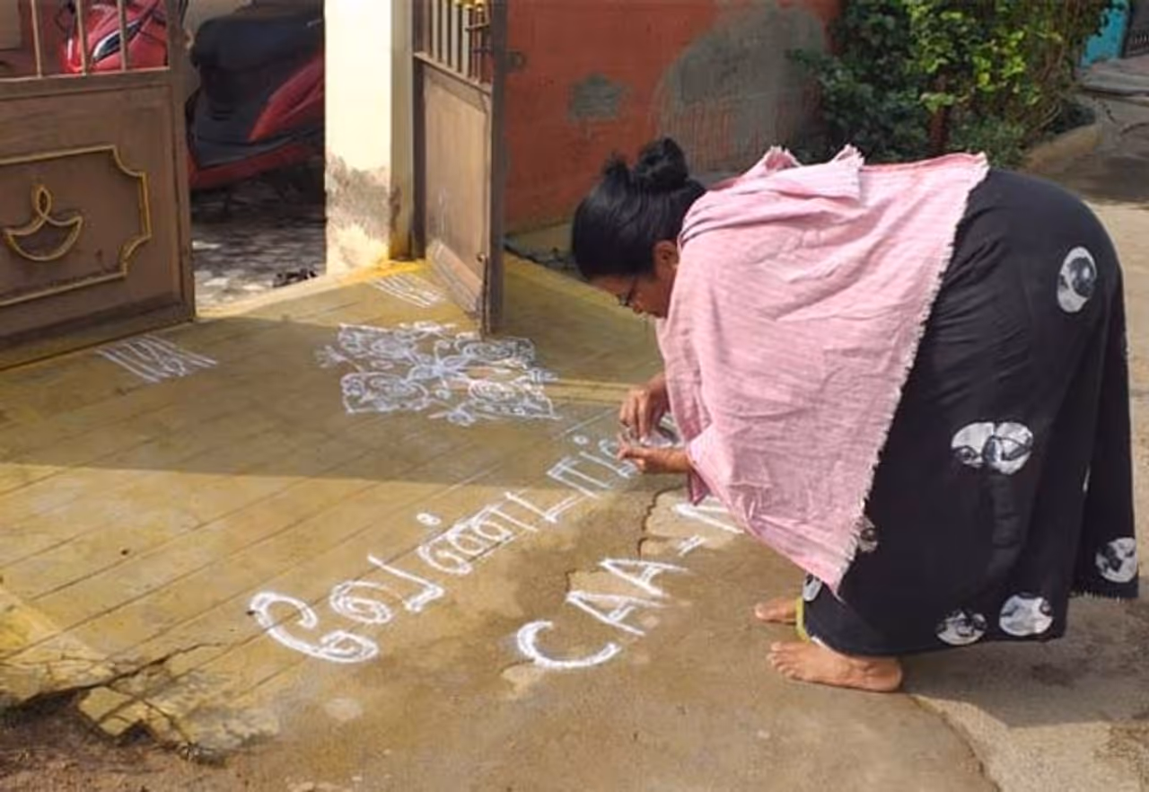 இந்நிலையில் சென்னை பெசன்ட்நகரில் இந்த சட்டத்திற்கு எதிர்ப்பு தெரிவித்து வழக்கறிஞர் காயத்ரி உட்பட சில பெண்கள் கோலமிட்டனர். இதனையடுத்து 6 பெண்கள் போலீசாரால் கைது செய்யப்பட்டனர். இதற்கு ஸ்டாலின் கடும் கண்டனம் தெரிவித்து இருந்தார்.