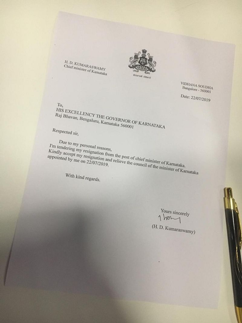 இந்நிலையில் இவ்விவகாரம் தொடர்பாக குமாரசாமி சட்டசபையில் கடிதமொன்றை வைத்து பேசினார். அவரது கையெழுத்திட்ட ராஜினாமா கடிதம் என சித்தரிக்கப்பட்டுள்ளதாக விமர்சனம் செய்துள்ளார்.