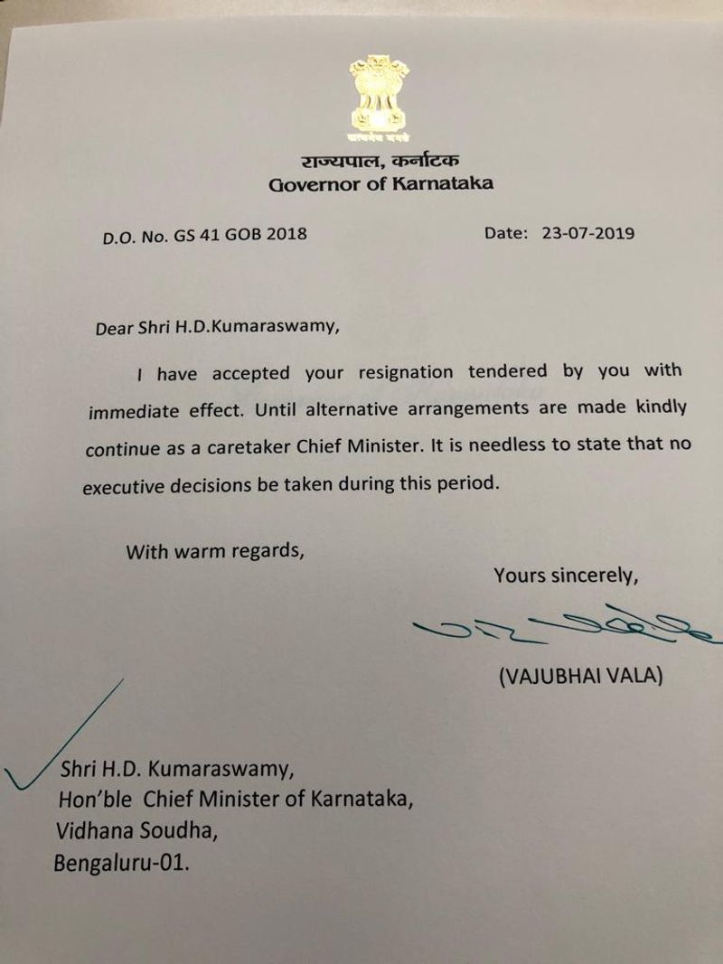 அரசு கவிழ்ந்ததையடுத்து முதலமைச்சர் குமாரசாமி ஆளுநரை சந்தித்து தனது ராஜினாமா கடிதத்தை அளித்தார்.