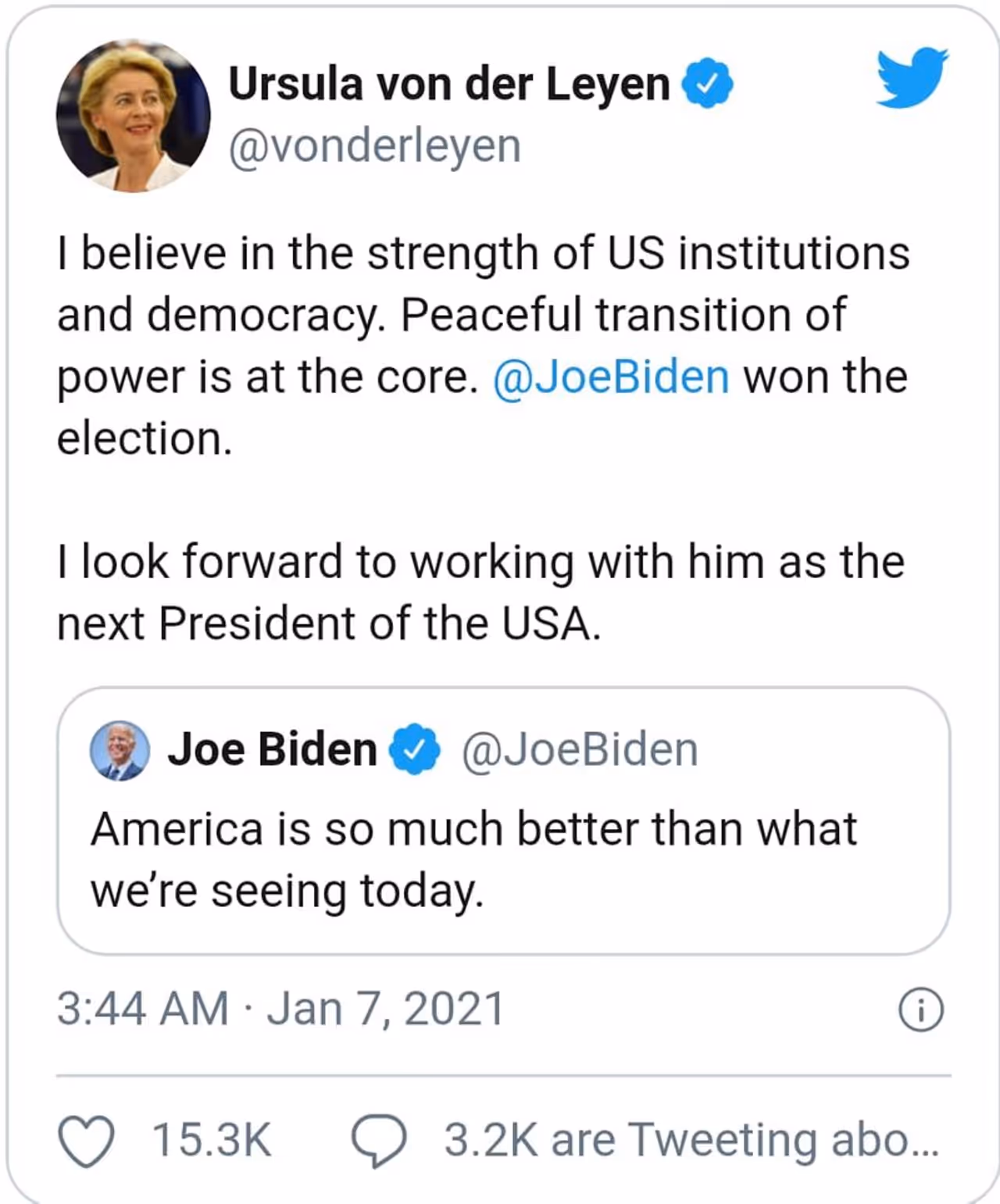 அதேபோல் இது குறித்து தெரிவித்துள்ள ஐரோப்பிய ஆணையத்தின் தலைவர் உர்சுலா வான் டெர் லயன், அமெரிக்க பாராளுமன்றம் மற்றும் ஜனநாயகத்தின் வலிமையை நான் நம்புகிறேன். அமைதியான அதிகார மாற்றம் மிகவும் முக்கியமானது. ஜோபிடன் தேர்தலில் வெற்றி பெற்றார் அவருக்கே ஆதரவு அளிக்க வேண்டும் என பதிவிட்டுள்ளார்.