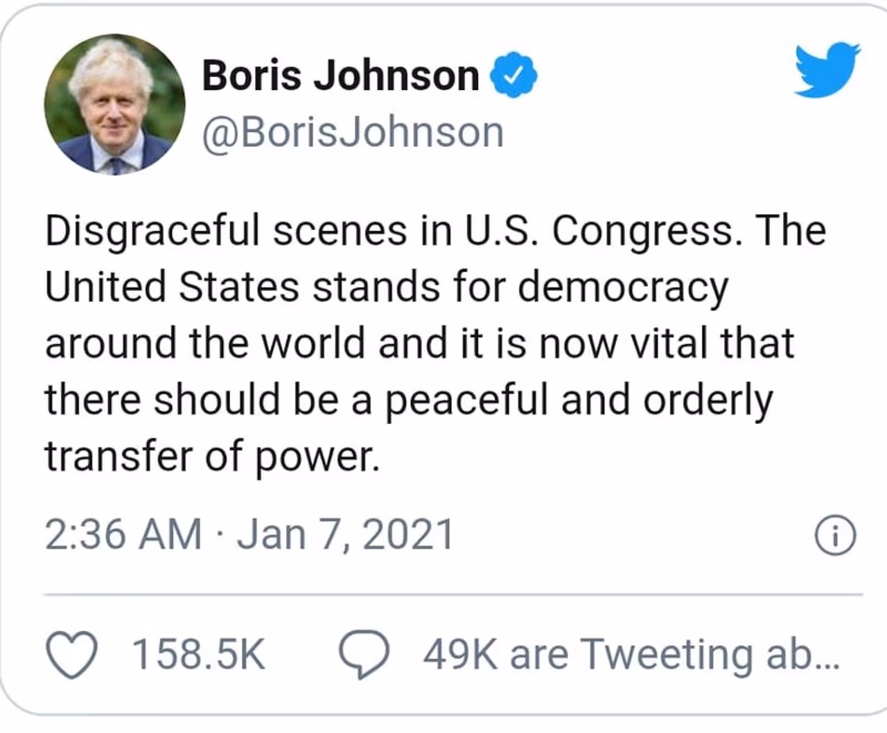 பின்னர் அவர்கள் பாராளுமன்ற வளாகத்திற்குள் நுழைய முயன்றனர். இதனால் அதனை தடுக்க போலீசார் துப்பாக்கிச்சூடு நடத்தினர், அதில் ஒரு பெண் உயிரிழந்தார். இதனைத் தொடர்ந்து அங்கு போராட்டம் வன்முறையாக மாறியது. பின்னர் ஏராளமான பாதுகாப்பு படையினர் அங்கு குவிக்கப்பட்டு அக் கலவரம் கட்டுக்குள் கொண்டுவரப்பட்டது. அமெரிக்க பாராளுமன்ற வளாகத்தில் நடைபெற்ற வன்முறைக்கு சர்வதேச நாடுகளின் தலைவர்கள் கண்டனம் தெரிவித்துள்ளனர். இந்நிலையில் இது குறித்து தெரிவித்துள்ள இங்கிலாந்து பிரதமர் போரிஸ் ஜான்சன், அமெரிக்க பாராளுமன்ற வளாகத்தில் நடைபெற்ற வன்முறை அவமானகரமானது. இது அமெரிக்காவில் ஜனநாயகத்திற்கு எதிரான தாக்குதல், அமைதியான மற்றும் ஒழுங்கான அதிகாரி பரிமாற்றம் நடைபெற வேண்டும் என்பது மிக அவசியம் என அவர் தனது டுவிட்டர் பக்கத்தில் கருத்து பதிவிட்டுள்ளார்.