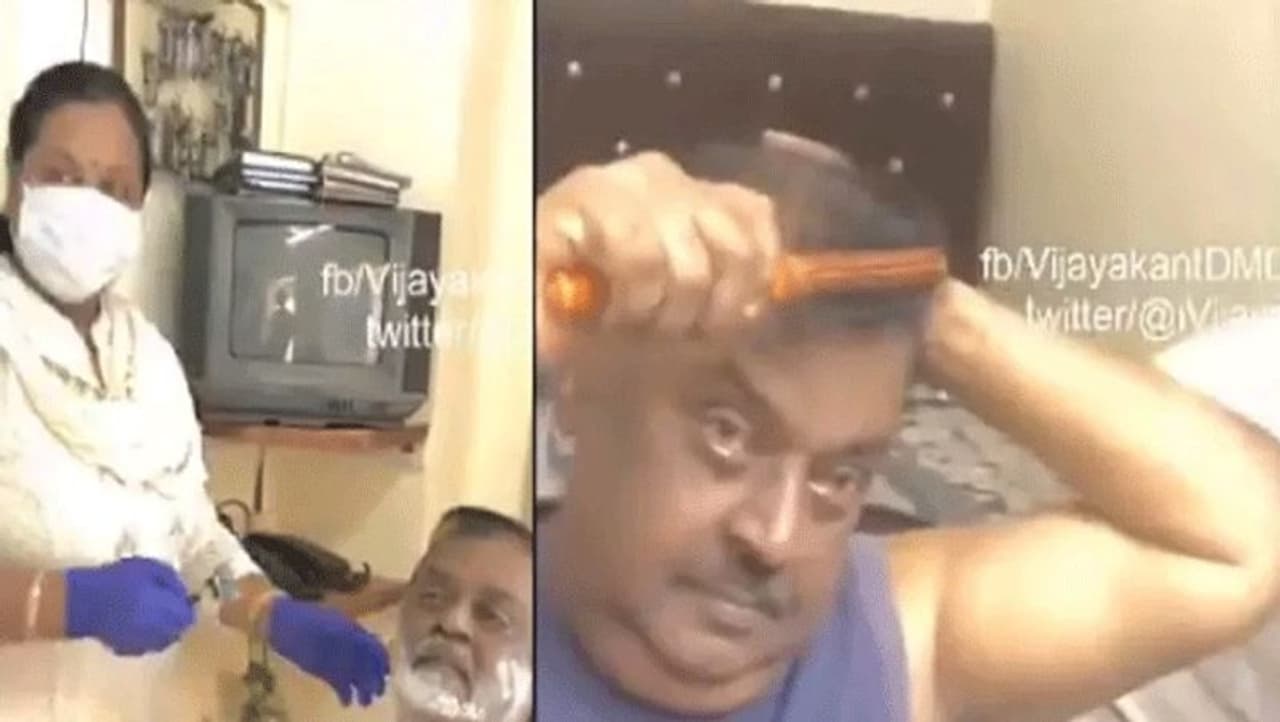 ஊரடங்கு காரணமாக மக்கள் வீடுகளிலேயே முடங்கி உள்ள நிலையில் தேமுதிக தலைவர் விஜயகாந்துக்கு முடி திருத்தி, ஷேவ் செய்து, டை அடித்து, நகம் வெட்டி அன்பாக அவரது மனைவி பிரேமலதா விஜயகாந்த் கவனித்து கொண்டார். இதுதொடர்பான வீடியோ காட்சிகள் சமூக வலைதளங்களில் வைரலாகி வருகிறது.