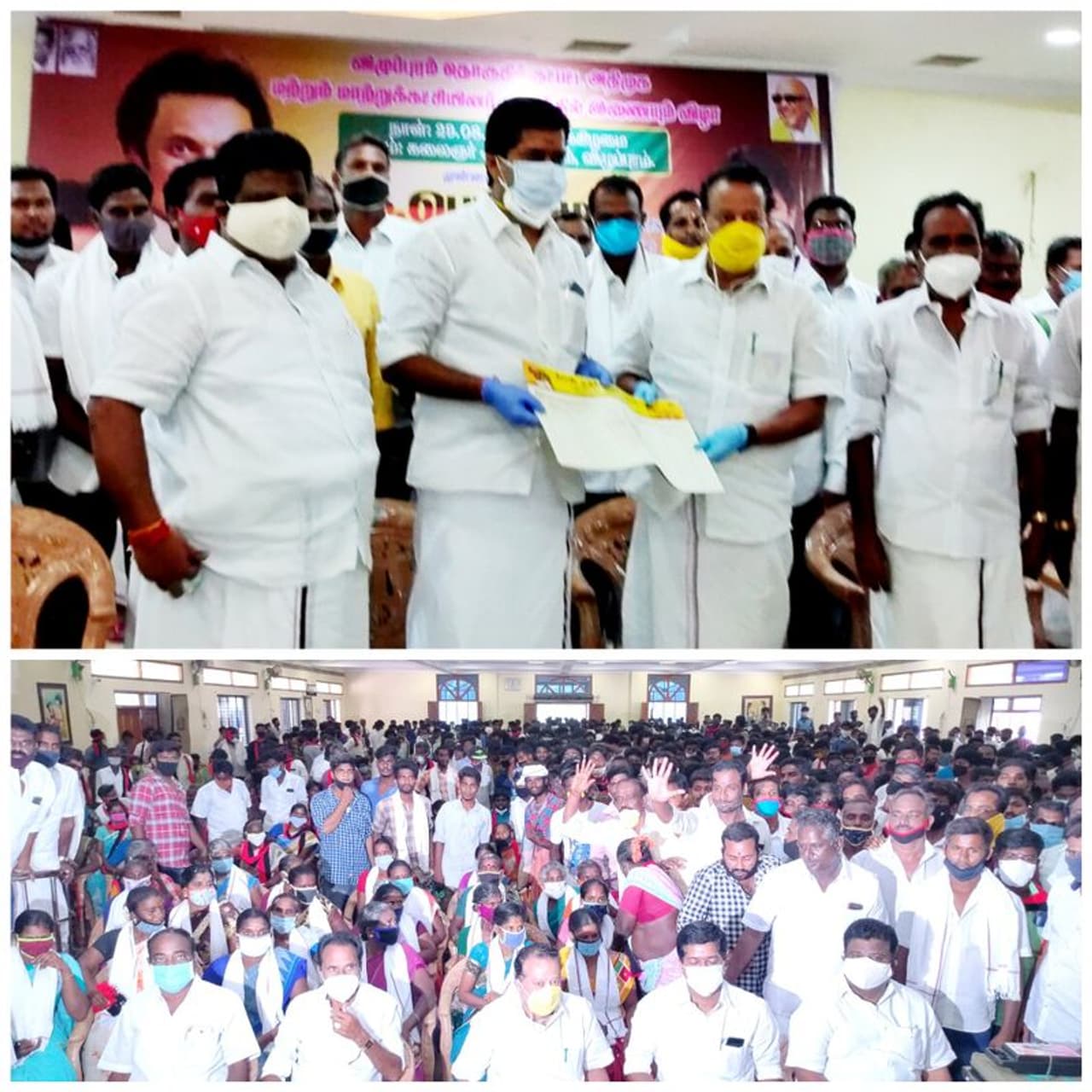 லாக்டவுனில் நடைமுறைகள் அமலில் இருக்கும் போது கூட்டம் கூடுவது தடை செய்யப்பட்டுள்ளது. திருமணம் மற்றும் துக்க நிகழ்ச்சிகளுக்கு கூட அளவான நபர்களுக்கு மட்டுமே அனுமதி அளிக்கப்பட்டுள்ளது, இந்நிலையில் அதிமுகவில் இருந்து விலகி திமுகவில் இணைந்த அதிமுக முன்னாள் மாவட்ட செயலாளரும், முன்னாள் எம்.பி.யுமான லட்சுமணன் ஆதரவாளர்கள் திமுகவில் இணையும் நிகழ்ச்சி நேற்று நடைபெற்றது. விழுப்புரம் கலைஞர் அரங்கில் நடைபெற்ற இந்த நிகழ்ச்சியில் திமுக மத்திய மாவட்ட செயலாளர் பொன்முடி தலைமையில் நடந்த நிகழ்ச்சியில், பல்வேறு கட்சிகளைச் சேர்ந்த 2,094 பேர் பங்கேற்றனர்.