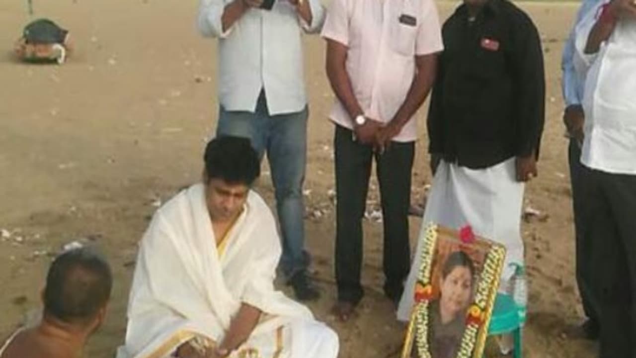 மறைந்த ஜெயலலிதாவுக்கு அவரின் அண்ணன் மகள் ஜெ.தீபாவின் கணவர் மாதவன் இன்று திதி கொடுத்தார்.