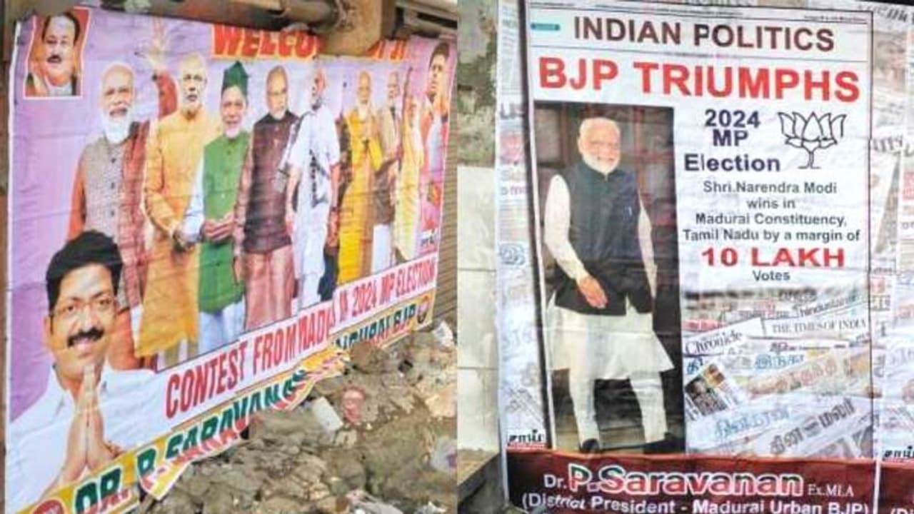 சென்னையின் பிரதான சாலைகளில் பளிச்சிடும் இந்த போஸ்டர் பலரது கவனத்தையும் ஈர்த்து வருகிறது. மதுரைக்காரர்களுக்கும் போஸ்டர்களுக்கும் அப்படி என்ன தான் பந்தமோ தெரியவில்லை, அந்த ஊர் அரசியல்வாதிகள் அடித்து ஒட்டும் சுவரொட்டிகள் ஒவ்வொன்றும் ஒவ்வொரு ரகமாக இருக்கிறது. அந்த வரிசையில் மதுரை மாநகர் மாவட்ட பாஜக தலைவர் டாக்டர் சரவணன் அடித்து ஒட்டியுள்ள இந்த சுவரொட்டியும் இடம்பிடித்துள்ளது.