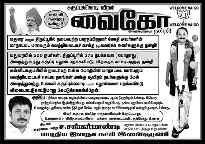 இந்நிலையில் வைகோ கருப்புக் கொடி காட்டியதற்கு அவரை கலாய்த்து மதுரை பாஜக சார்பில் வால் போஸ்டர்கள் ஒட்டப்பட்டுள்ளன. அதில் மதுரை மற்றும் திருப்பூரில் நடைபெற்ற பிரதமர் மோடியின் மாநாட்டை மாபெரும் வெற்றி அடையச் செய்த வைகோ அவர்களுக்கு நன்றி என குறிப்பிடப்பட்டுள்ளது.