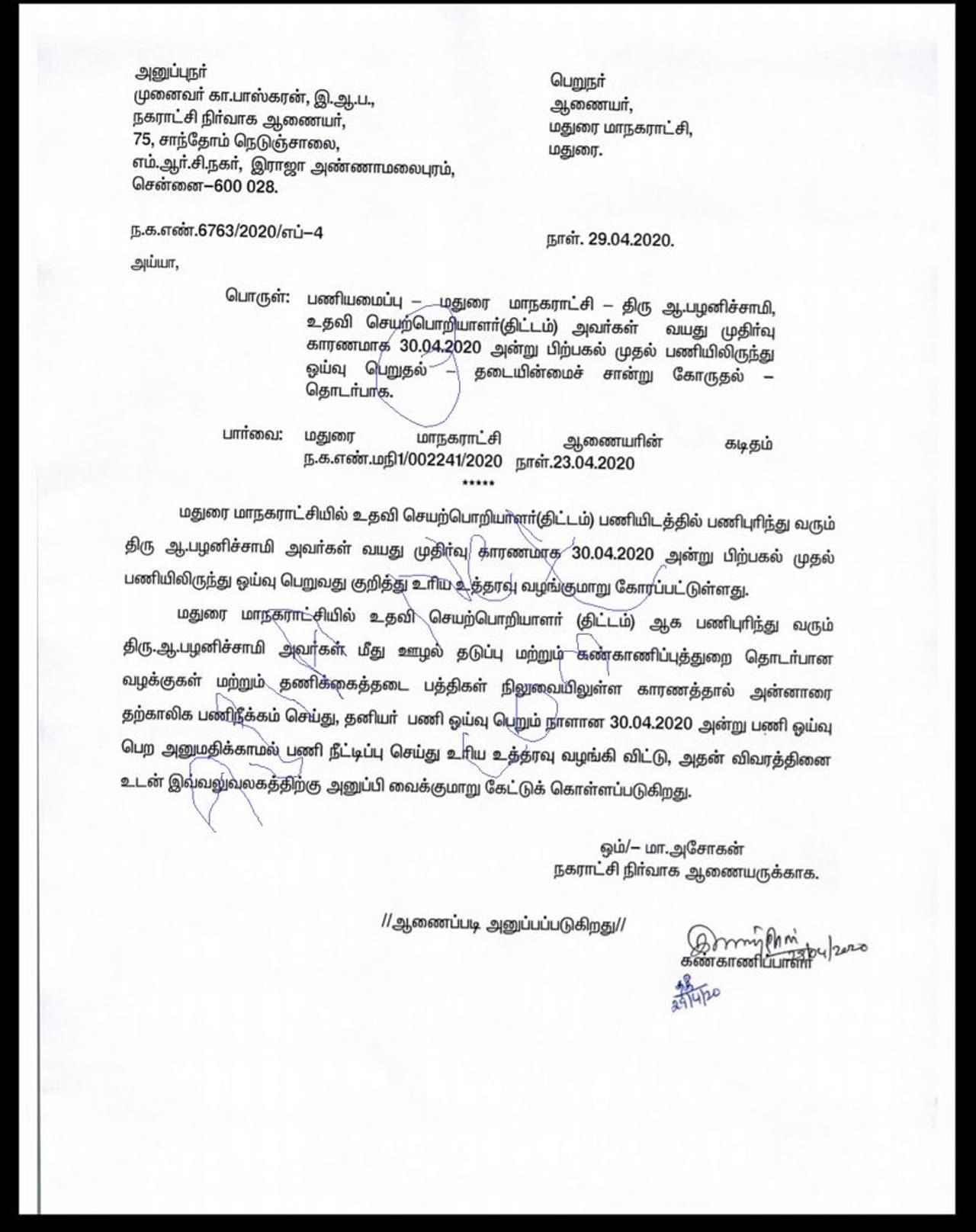 மதுரை மாநகராட்சியில் பல்வேறு சர்ச்சைகளுடன் அதிகாரிகள் முதல் அரசியல்வாதிகள் வரைக்கும் கொடிகட்டி பறந்து வந்த உதவி பொறியாளர் (திட்டம்) பழனிச்சாமி 30.04.2020 அன்று பணி ஓய்வு பெற இருந்தநிலையில் நகராட்சி நிர்வாகம் அணையர் சஸ்பெண்ட் செய்து உத்தரவிட்டுள்ளார்