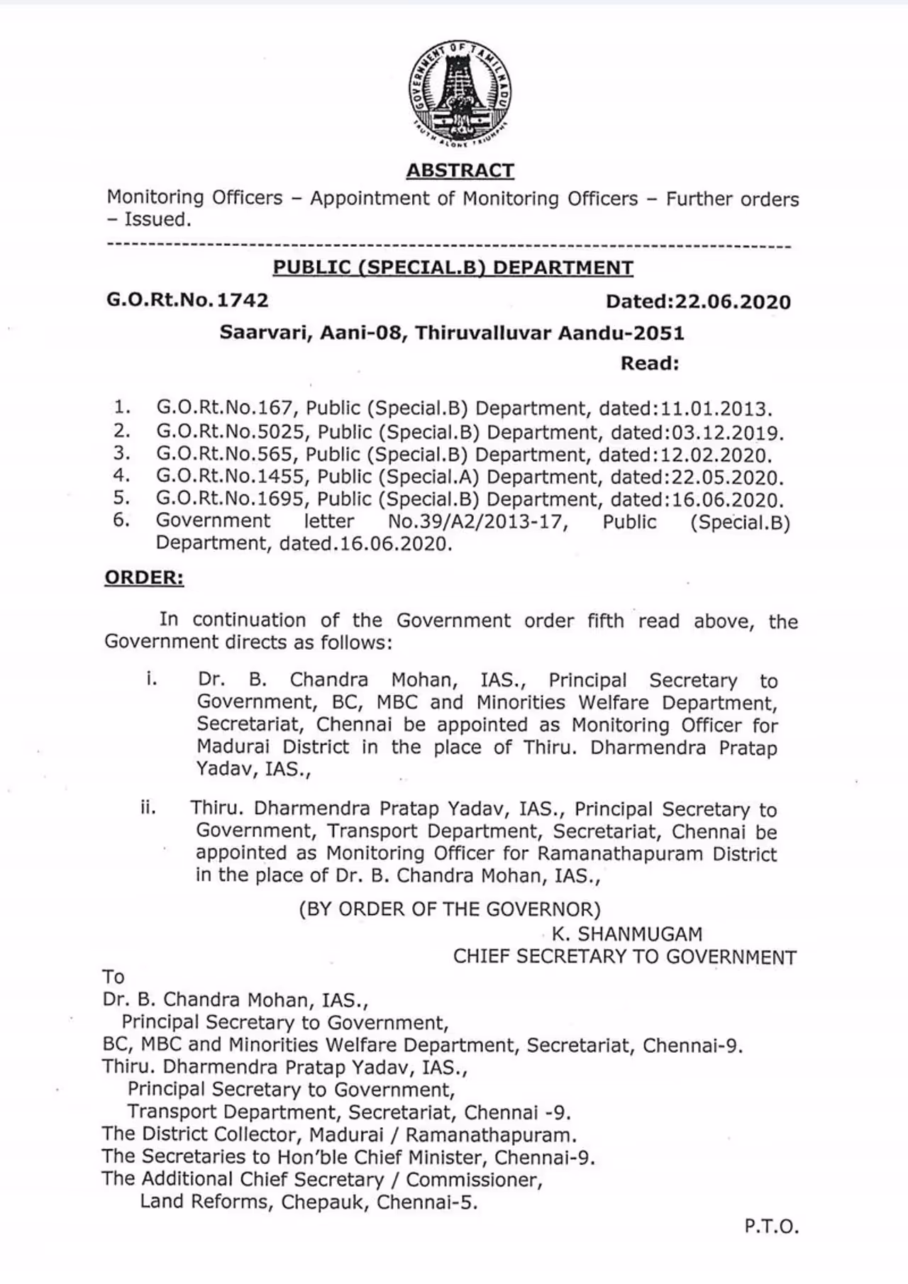 மதுரை மாவட்ட கொரோனா தடுப்பு கண்காணிப்பு அதிகாரி தர்மேந்திர பிரதாப் மாற்றப்பட்டு உள்ளார். அவருக்கு பதிலாக புதிய கொரோனா தடுப்பு அதிகாரியாக சந்திர மோகன் நியமனம் செய்யப்பட்டு உள்ளார். தர்மேந்திர பிரதாப் ராமநாதபுரம் மாவட்ட கொரோனா தடுப்பு அதிகாரியாக நியமனம் செய்யப்பட்டு உள்ளார்.