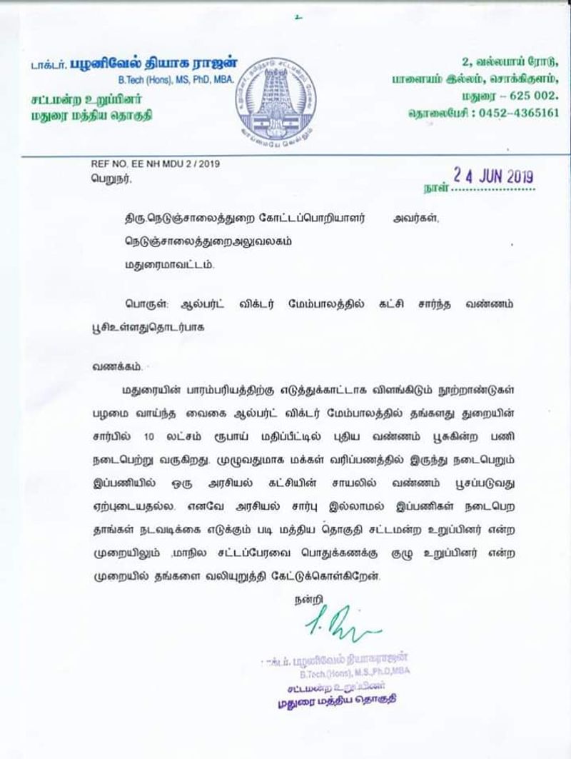 மதுரையில் புகழ்பெற்ற பழம்பெருமை வாய்ந்த ஆல்பர்ட் விக்டர் பாலத்துக்கு காவி வண்ணம் பூசப்படுவதற்கு திமுக கடும் எதிர்ப்புத் தெரிவித்துள்ளது. மக்கள் வரிப்பணத்தில் ஒரு அரசியல் கட்சியின் சாயலில் வண்ணம் பூசப்படுவதை ஒரு போதும் ஏற்றுக் கொள்ள முடியாது என திமுக எம்எல்ஏ பி.டி.ஆர்.பானிவேல் தியாகராஜன் கடும் கண்டணம் தெரிவித்துள்ளார்.