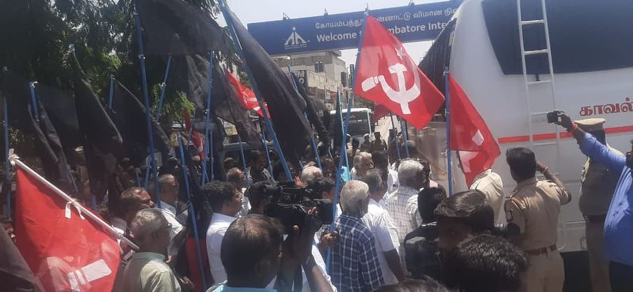 ஆனால் மார்க்சிஸ்ட் கம்யூனிஸ்ட் கட்சியினர் போராட்டத்தை கைவிட மறுத்த நிலையில் போலீசார் 50 மேற்பட்ட மார்க்சிஸ்ட் கம்யூனிஸ்ட் கட்சியினரை கைது செய்து வேனில் ஏற்றினர். இதனால் கோவை விமான நிலையம் முன்பு பரபரப்பு ஏற்பட்டது. இதனை தொடர்ந்து விமான நிலையம் மற்றும் அதனை சுற்றியுள்ள பகுதிகளில் போலீசார் தீவிர பாதுகாப்பு பணியில் ஈடுபட்டுள்ளனர்.