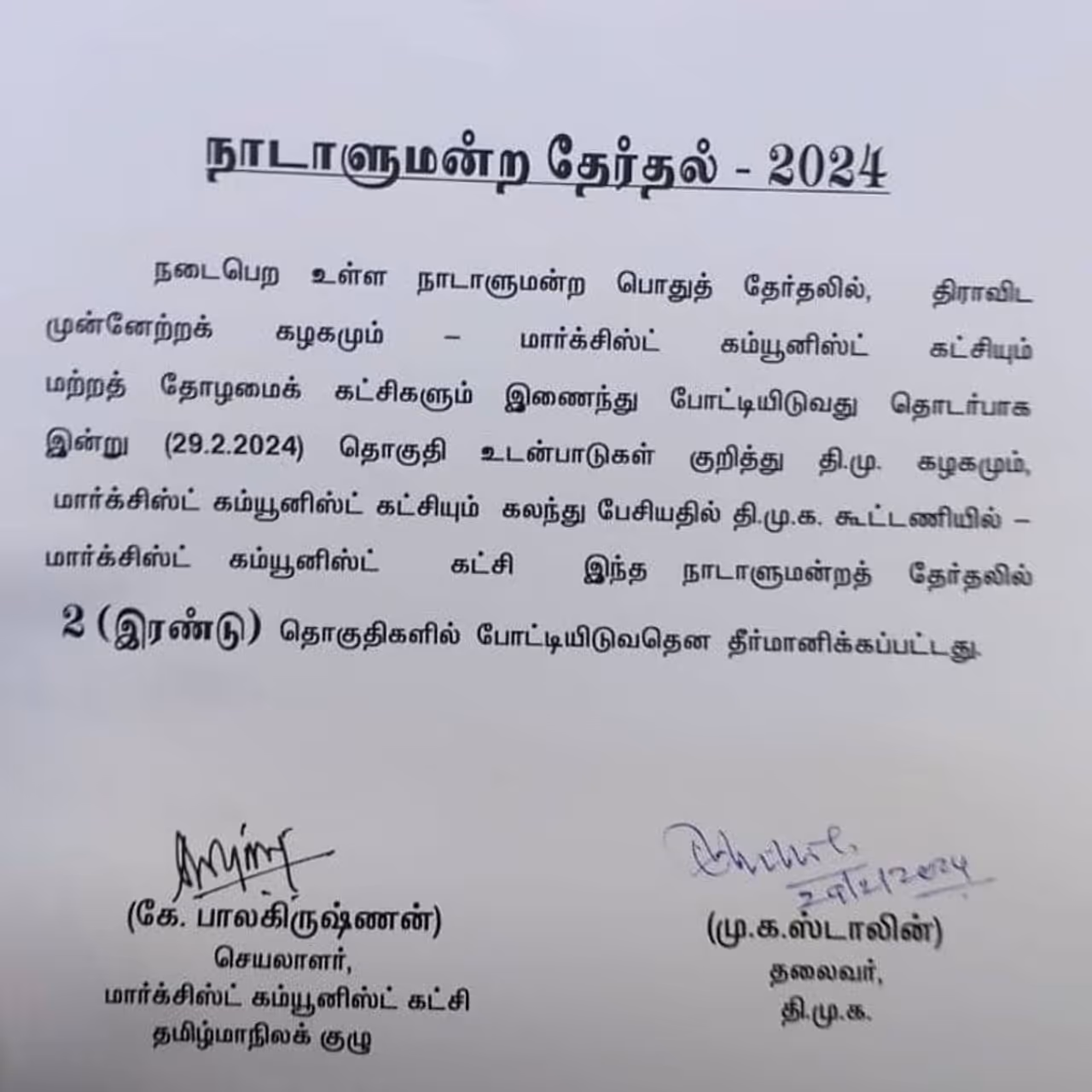 நாடாளுமன்ற தேர்தல் தேதி அடுத்த மாதம் மத்தியில் அறிவிக்கப்படவுள்ளது. இந்தநிலையில் திமுக தங்களது கூட்டணி கட்சியினரோடு தொகுதி பங்கீடு தொடர்பாக பேச்சுவார்த்தை நடத்தி வருகிறது. இதில் முஸ்லிம் லீக் மற்றும் கொமதேகவிற்கு தலா ஒரு தொகுதியை ஒதுக்கியது. இதனையடுத்து கூட்டணி கட்சியோடு இரண்டு கட்ட பேச்சுவார்த்தை முடிவடைந்த நிலையில் இன்று 3ஆம் கட்ட பேச்சுவார்த்தையை திமுக நடத்தியது. அந்த வகையில் திமுக கூட்டணியில் மார்க்சிஸ்ட் கம்யூனிஸ்ட் கட்சிக்கு இரண்டு தொகுதியும், இந்திய கம்யூனிஸ்ட் கட்சிக்கு இரண்டு தொகுதியும் ஒதுக்கப்பட்டுள்ளது. அதே நேரத்தில் மதிமுகவிடம் நடைபெற்ற பேச்சுவார்த்தையில் முன்னேற்றம் ஏற்படாத நிலை உருவாகியுள்ளது.