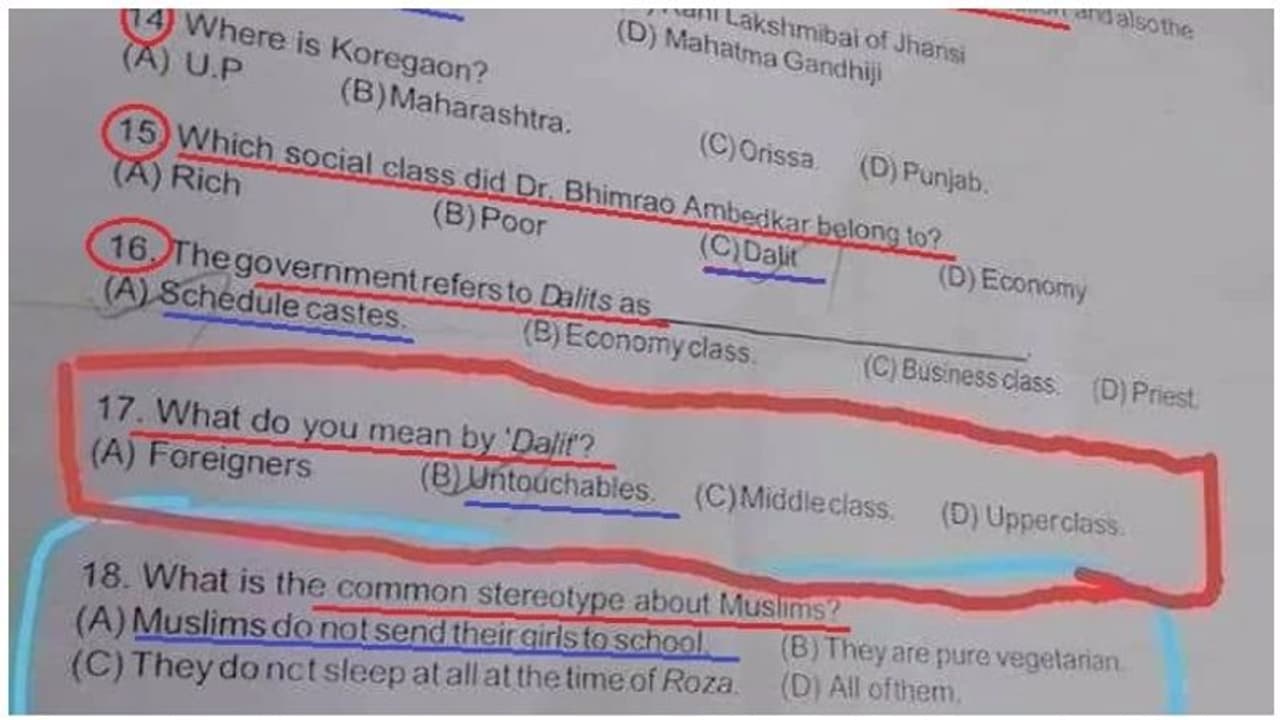 டாக்டர் அம்பேத்கர் எந்த வகுப்பைச் சேர்ந்தவர்? முஸ்லீம்கள் யார்? தலித் என்றால் என்ன? தலித் தலைவர் யார்? என்ற கேள்விகள் முன் வைக்கப்பட்டுள்ளன. தலித்துகள் என்பதன் பொருள் என்ன? கேள்விக்கு விடையாக “அந்நியர்கள், தீண்டத்தகாதவர்கள்,நடுத்தர வர்க்கத்தினர், உயர் வகுப்பினர்” என்று பதில் தரப்பட்டுள்ளது. இந்த நான்கில் ஒன்றை மாணவர்கள் பதிலாக குறிப்பிட வேண்டும்.