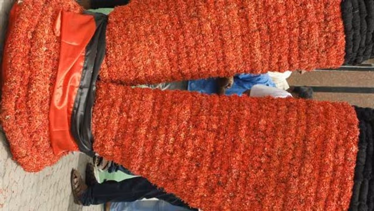 திருச்சியில் தி.மு.க. அலுவலகமான கலைஞர் அறிவாலயத்தில், ஆசிரியர்களுக்கு விருது வழங்கும் விழா நேற்று நடைபெற்றது. இதில், நகர்ப்புற வளர்ச்சி துறை அமைச்சர் நேரு சிறப்பு அழைப்பாளராக பங்கேற்றார். நிகழ்ச்சியை நடத்தியவர்கள், நேருவை வரவேற்க 1 லட்சம் ரூபாய் செலவில், 500 கிலோ பூக்கள் மற்றும் கயிறு மூலம் கருப்பு, சிவப்பில் மெகா சைஸ் மாலை தயாரித்தனர். அதை ஆட்களால் தூக்க முடியாது என்பதால், கிரேன் மூலம் மாலையை தூக்கி நிறுத்தி இருந்தனர்.