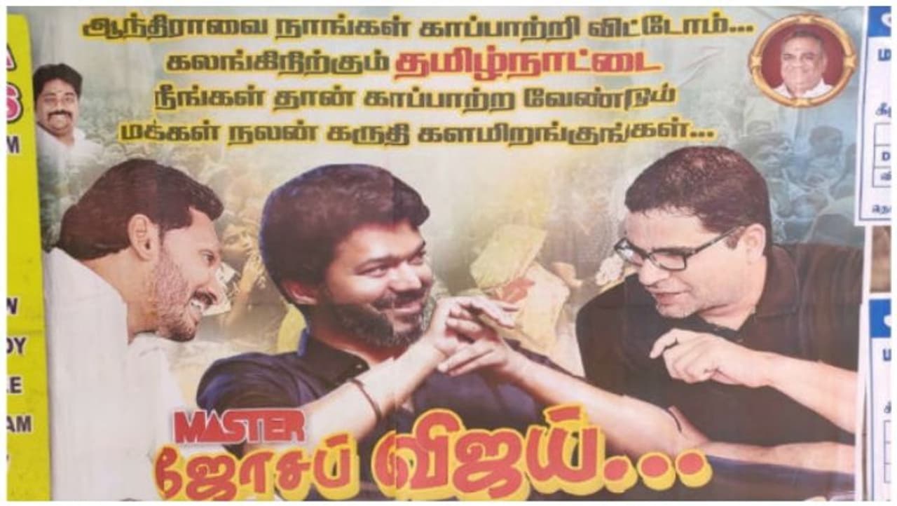 அதில் நடிகர் விஜயுடன், ஆந்திர முதல்வர் ஜெகன் மோகன் ரெட்டி, தேர்தல் ஆலோசகர் பிரசாந்த் கிஷோர் பேசுவது போல் போஸ்டர் ஒட்டப்பட்டிருந்தது. அதுமட்டுமின்றி ஆந்திராவை நாங்கள் காப்பாற்றி விட்டோம். கலங்கி நிற்கும் தமிழ்நாட்டை நீங்கள்தான் காப்பாற்ற வேண்டும். மக்கள் நலன் கருதி களமிறங்குங்கள் என்ற வாசகம் இடம்பெற்றதால் பரபரப்பு ஏற்பட்டது.