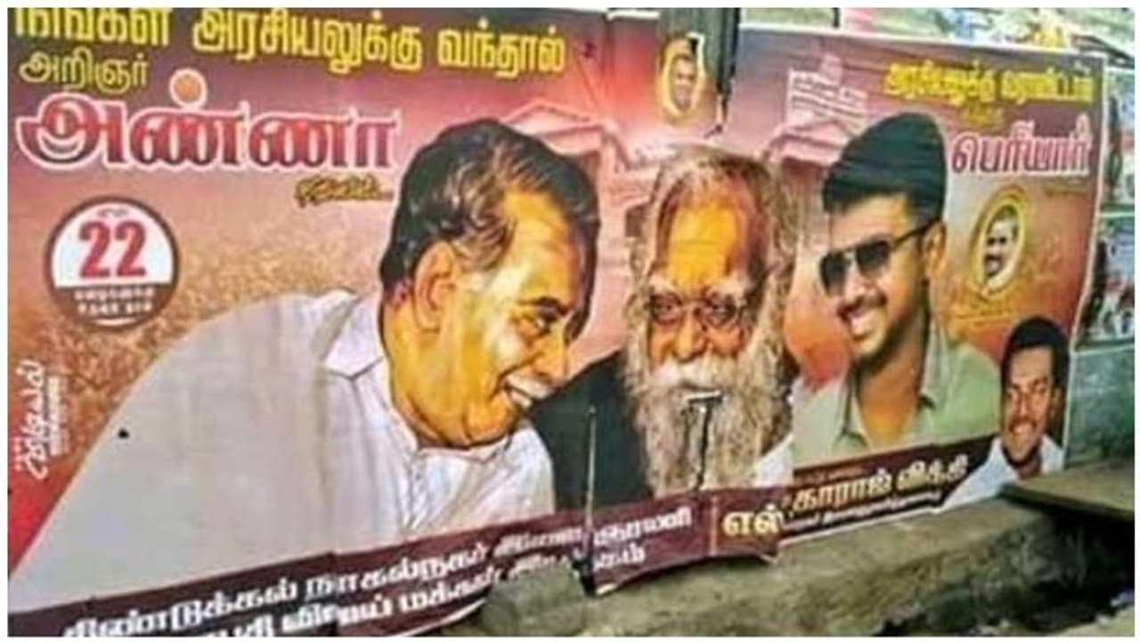 தமிழகத்தில் ரசிகர்களை தன் வசப்படுத்தி இருக்கும் நடிகர் விஜய், தனது படங்களில் தொடர்ந்து அரசியல் கருத்துகளை கூறி வருகிறார். இவர் ஏற்கனவே விஜய் மக்கள் இயக்கத்தை தொடங்கி, உறுப்பினர்களை சேர்க்கும் பணியில் தீவிரமாக ஈடுபட்டு வருகிறார். அவர் அரசியலுக்கு வருவது உறுதியாகி உள்ள நிலையல், கடந்த ஜூன் மாதம் திண்டுக்கல்லில் ஒட்டப்பட்ட விஜய்யின் பிறந்தநாள் போஸ்டர் ஒன்று பெரும் சர்ச்சையை ஏற்படுத்தியது. அந்த போஸ்டரில் நடிகர் விஜய்யுடன், அண்ணாவும், பெரியாரும் இருப்பது போல் ஒட்டப்பட்டுள்ளது. அதன் மேலே, நீங்கள் அரசியலுக்கு வந்தால் அறிஞர் அண்ணா, வராவிட்டால் பெரியார் எனும் வாசகம் இடம் பெற்றிருந்தது.