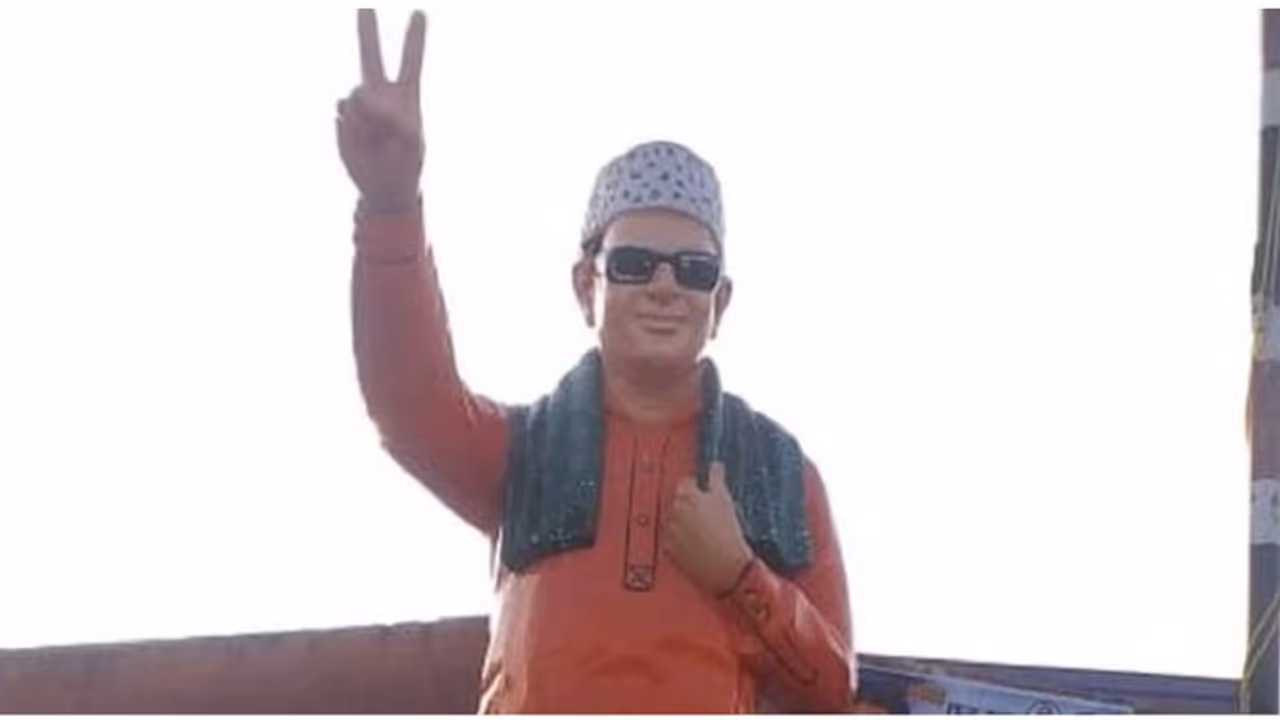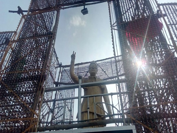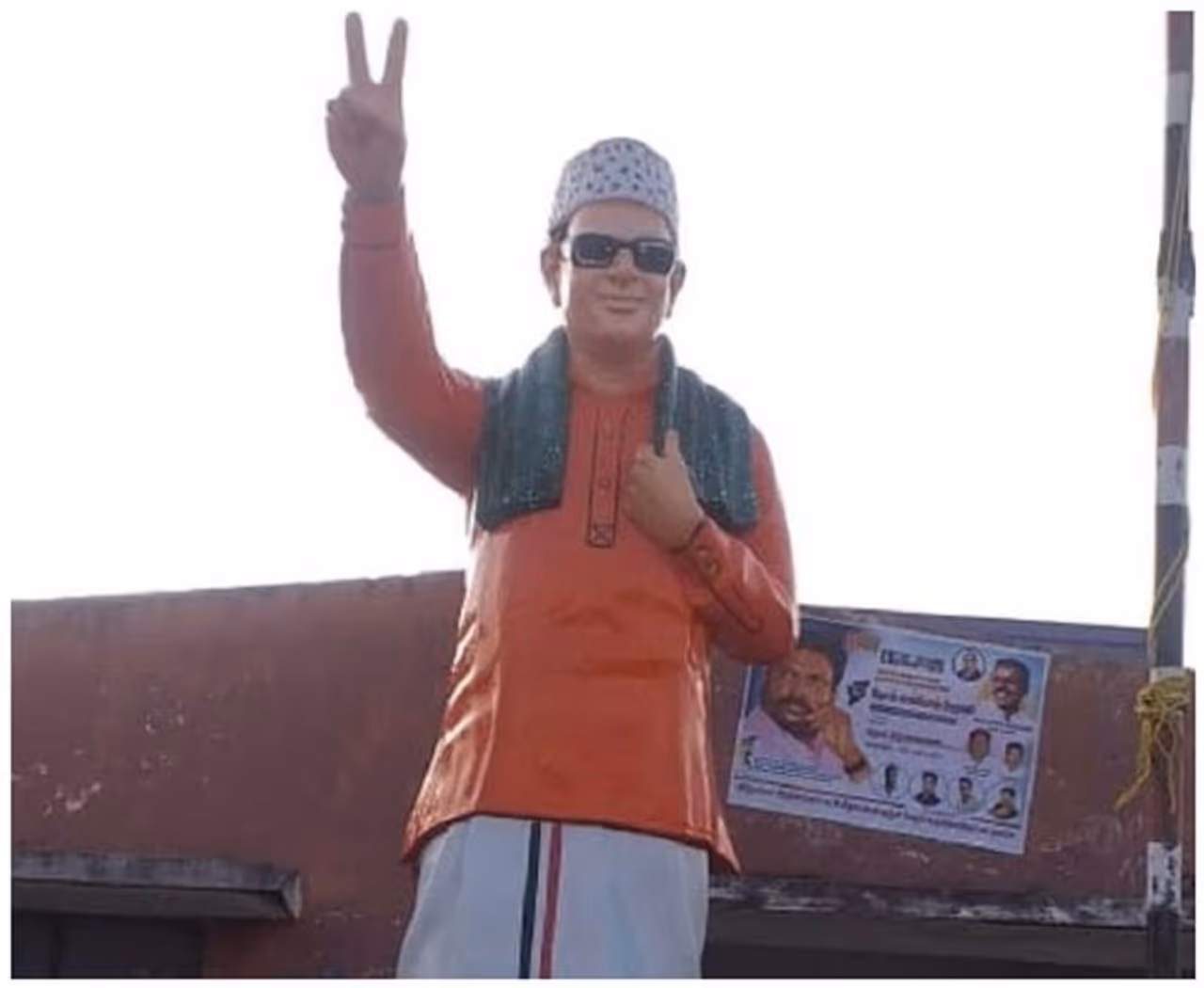 எம்.ஜி.ஆர். சிலையை எப்போது வெண்கலத்தில் அமைப்பது வழக்கம். வெண்கலம் அல்லாமல் காங்கிரீட் வடிவில் அமைக்கும்போது வெள்ளை சட்டை, வேட்டி. தொப்பி சகிதம் சிலையை வடிப்பது வழக்கம். ஆனால், திருவண்ணாமலை மாவட்டம் கருங்காலி குப்பம் கிராமத்தில் உள்ள எம்.ஜி.ஆர். சிலை வழக்கத்துக்கு மாறாக காவி நிறத்தில் உள்ளது பரபரப்பை உண்டாக்கியுள்ளது.