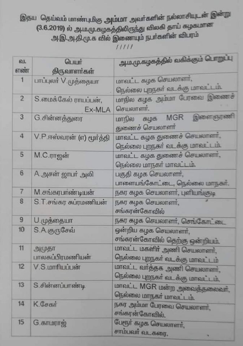 இந்நிலையில் நெல்லை தொகுதி அமமுக வேட்பாளராக போட்டியிட்ட மைக்கேல் ராயப்பன் உள்ளிட்ட 15 பேர் இன்று அமமுகவில் இருந்து விலகி முதலமைச்சர் எடப்பாடி பழனிசாமி முன்னிலையில் இன்று அதிமுகவில் இணைந்தனர்.