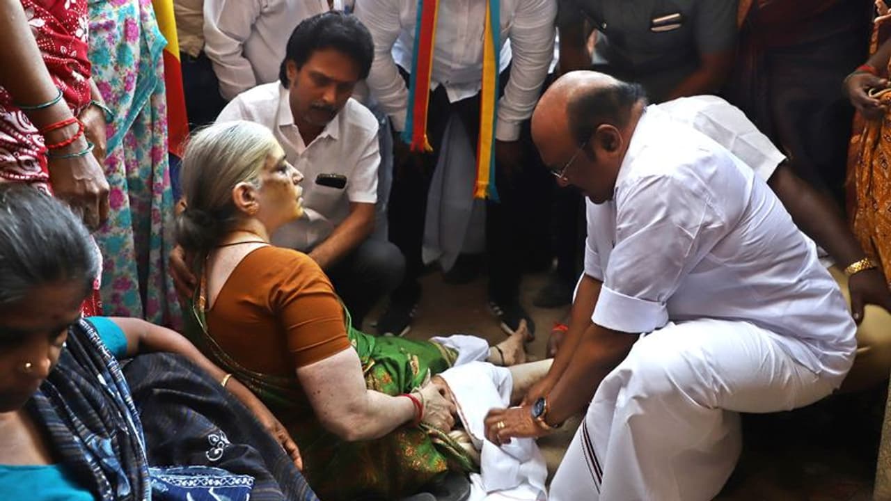 அப்போது சென்னை சூளைமேடு பகுதியில் அன்புமணி ராமதாஸ் பிரச்சாரக் கூட்டத்தில் ஸ்பீக்கர் ஒன்று ஒரு வயதான மூதாட்டியின் காலில் விழுந்தது.