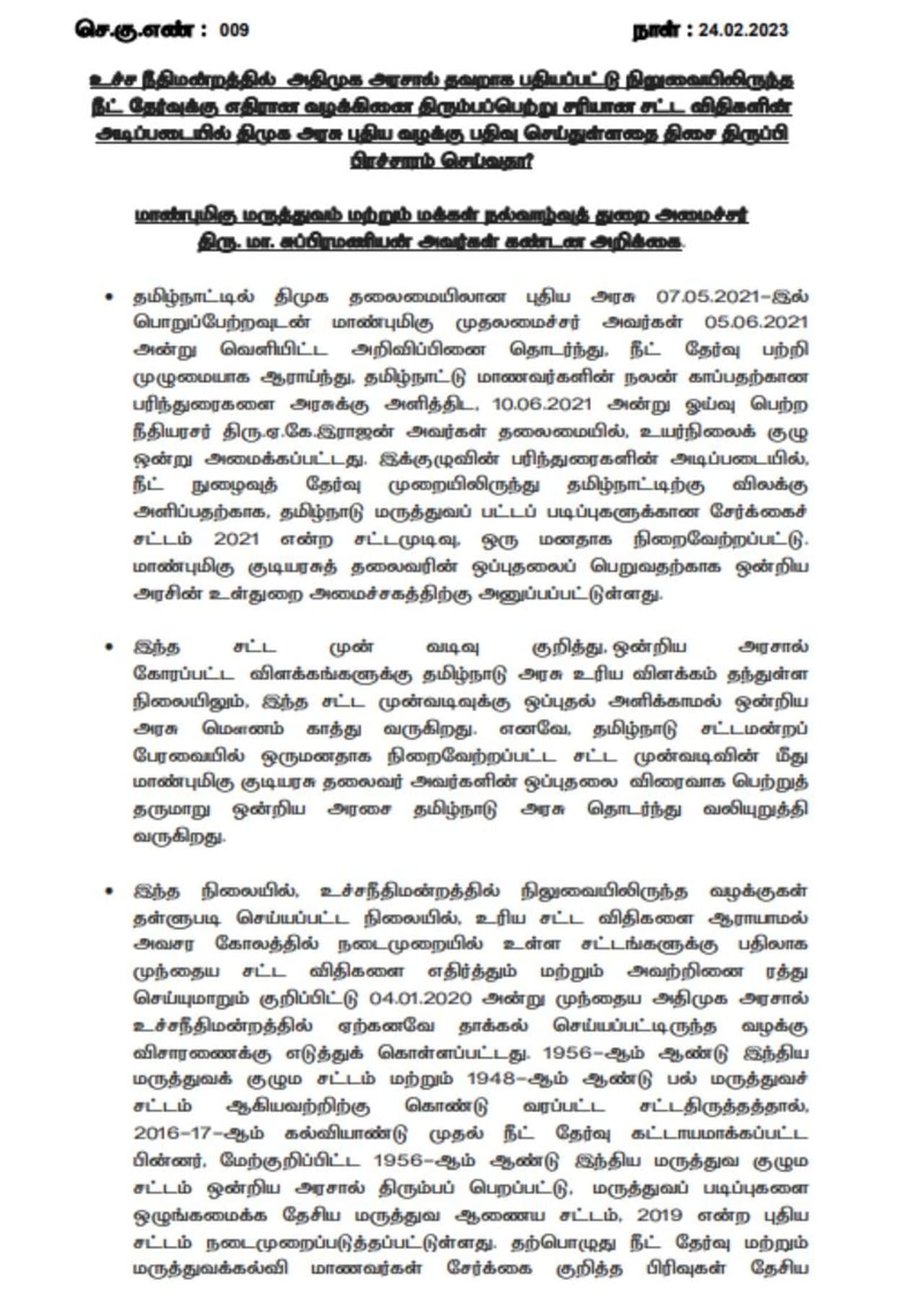 மருத்துவத்துறை அமைச்சர் மா.சுப்பிரமணியன் வெளியிட்டுள்ள அறிக்கையில், “தமிழ்நாட்டில் திமுக தலைமையிலான புதிய அரசு 07.05.2021-இல் பொறுப்பேற்றவுடன் மாண்புமிகு முதலமைச்சர் அவர்கள் 05.06.2021 அன்று வெளியிட்ட அறிவிப்பினை தொடர்ந்து, நீட் தேர்வு பற்றி முழுமையாக ஆராய்ந்து, தமிழ்நாட்டு மாணவர்களின் நலன் காப்பதற்கான பரிந்துரைகளை அரசுக்கு அளித்திட, 10.06.2021 அன்று ஓய்வு பெற்ற நீதியரசர் திரு.ஏ.கே.இராஜன் அவர்கள் தலைமையில், உயர்நிலைக் குழு ஒன்று அமைக்கப்பட்டது.