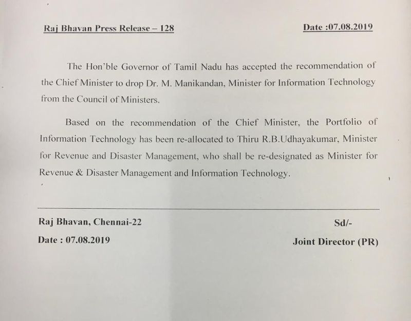 தமிழக அமைச்சரவையில் இருந்து, தகவல் தொழில்நுட்பத் துறை அமைச்சர் மணிகண்டன் நீக்கப்பட்டுள்ளதா அளுநர் மாளிகை தெரிவித்துள்ளது.