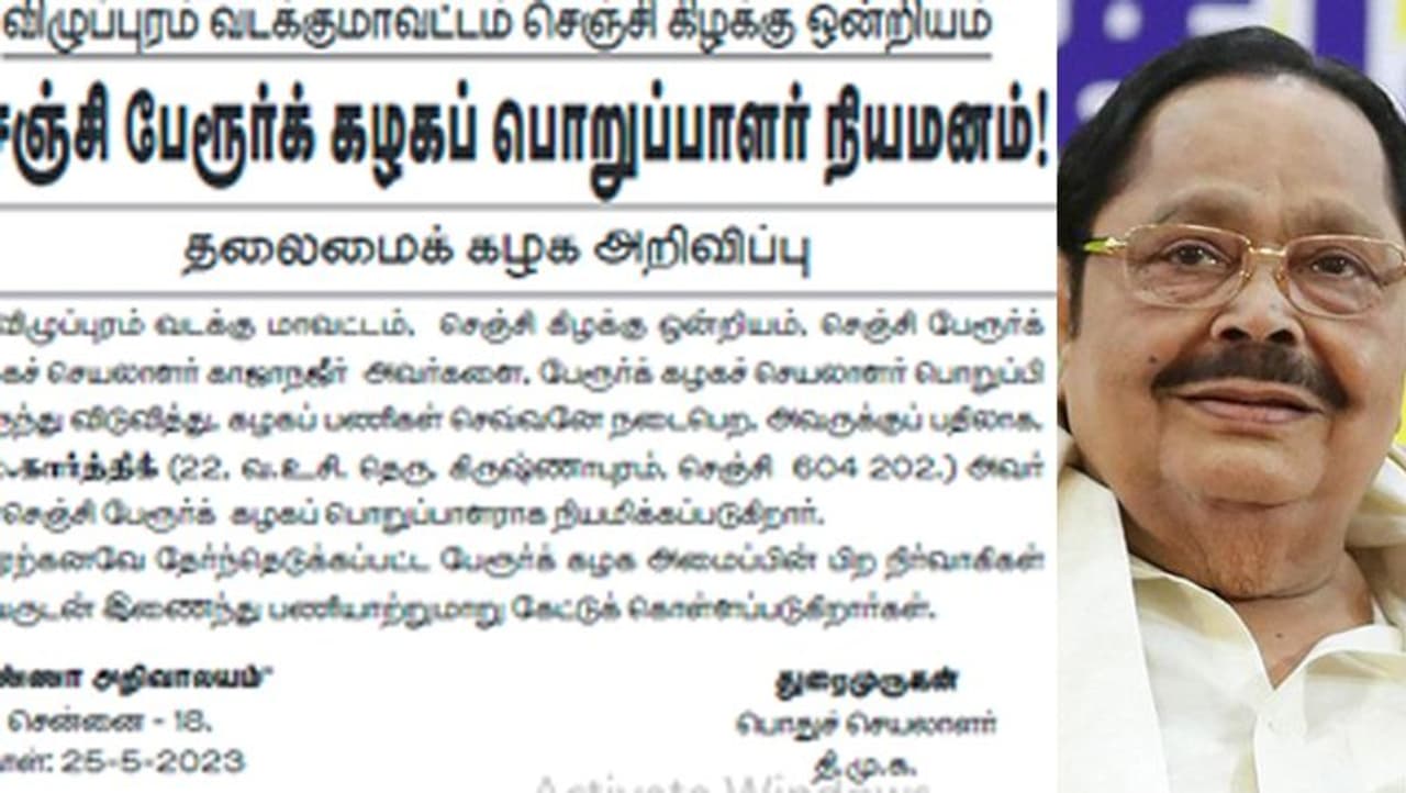 இதுதொடர்பாக பொதுச்செயலாளர் துரைமுருகன் வெளியிட்டுள்ள அறிவிப்பில்;- விழுப்புரம் வடக்கு மாவட்டட் செஞ்சி கிழக்கு ஒன்றியம் செஞ்சி பேரூர் கழக செயலாளர் காஜா நஜீர் அவர்களை பேரூர் கழக செயலாளர் பொறுப்பிலிருந்து விடுவித்து கழகப் பணிகள் செவ்வனே நடைபெற அவருக்கு பதிலாக எம்.கார்த்திக் அவர்கள் செஞ்சி பேரூர் கழகப் பொறுப்பாளராக நியமிக்கப்படுகிறார்.