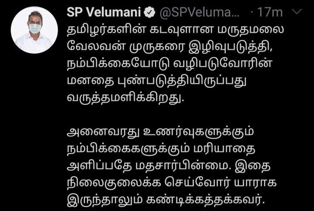 இதுகுறித்துஅவர் தம் ட்விட்டர் மற்றும் பேஸ்புக் பக்கத்தில், தமிழர்களின் கடவுளான மருதமலை வேலவன் முருகரை இழிவுபடுத்தி, நம்பிக்கையோடு வழிபடுவோரின் மனதை புண்படுத்தியிருப்பது வருத்தமளிக்கிறது என்று வேதனை தெரிவித்துள்ளார். அனைவரது உணர்வுகளுக்கும் நம்பிக்கைகளுக்கும் மரியாதை அளிப்பதே மதச்சார்பின்மை. இதை நிலைகுலைக்க செய்வோர் யாராக இருந்தாலும் கண்டிக்கத்தக்கவர்" என்று பதிவிட்டு தன்னுடைய கண்டனத்தை அமைச்சர் எஸ்.பி.வேலுமணி தெரிவித்துள்ளார்.