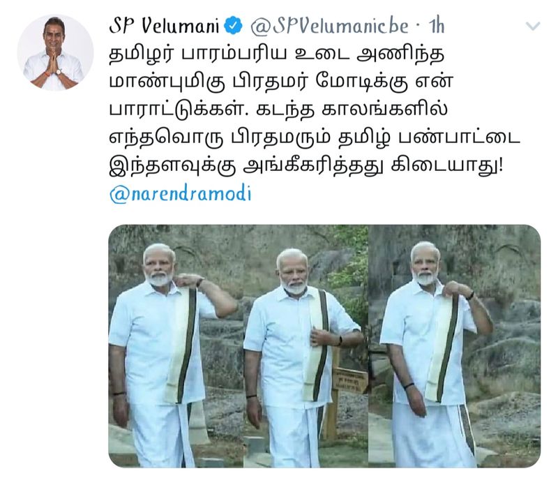 வேட்டி, சட்டை அணிந்து சீன அதிபரை வரவேற்ற பிரதமர் மோடியை அமைச்சர் எஸ்.பி வேலுமணி பாராட்டியுள்ளார்.
