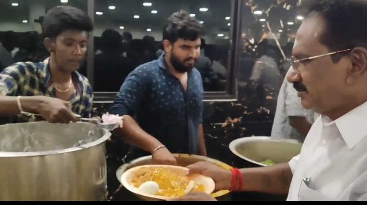 இந்த நிலையில் கூட்டம் முடிந்த பிறகு அதிமுகவினர்க்கு இரவு உணவாக பிரியாணி ஏற்பாடு செய்யப்பட்டிருந்தது. அதிமுகவினர் வரிசையாக நின்று பிரியாணியை பெற்று தரையில் அமர்ந்து சாப்பிட்டு கொண்டிருந்தனர்.