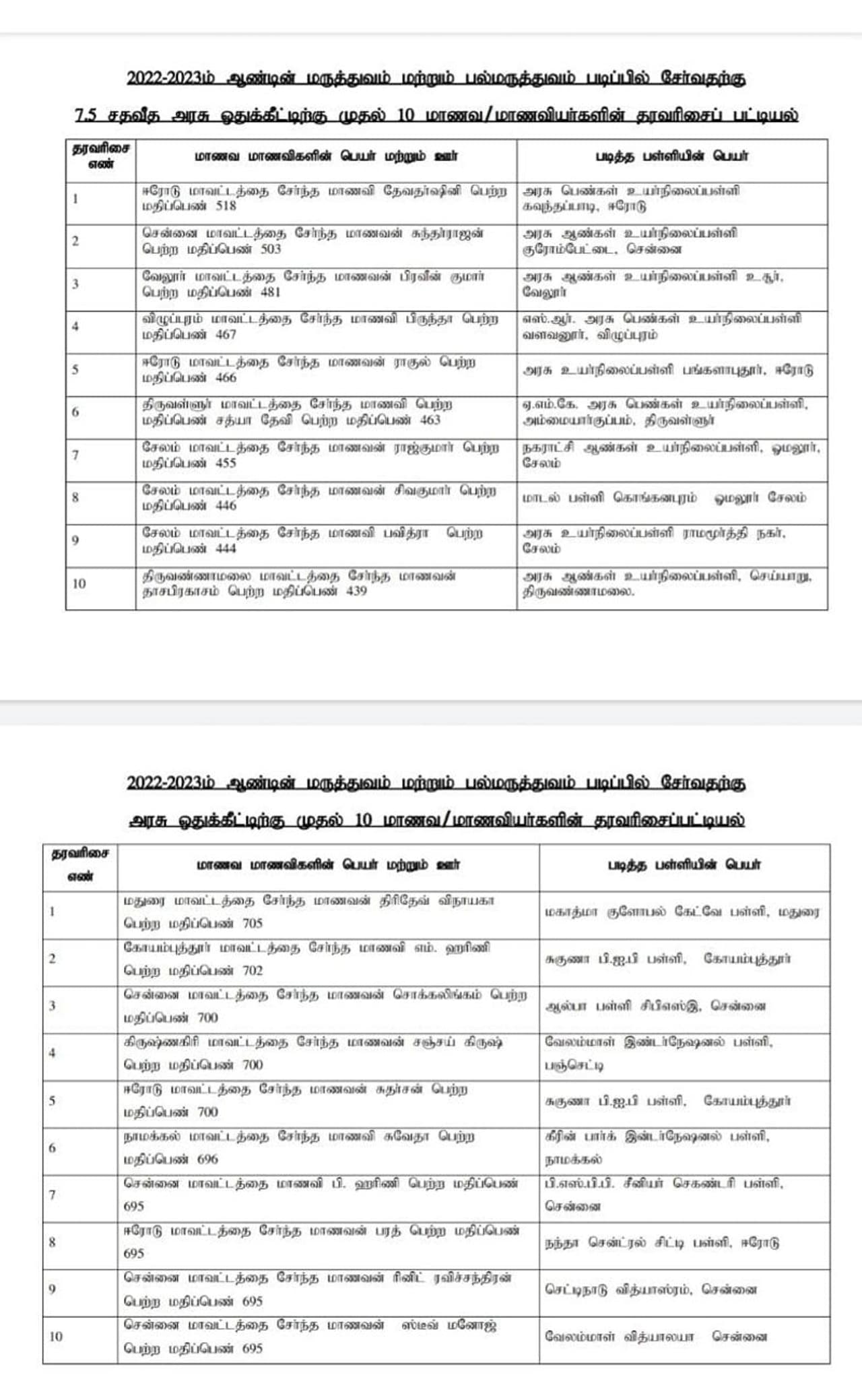எம்.பி.பி.எஸ், பி.டி.எஸ் படிப்புக்கான தரவரிசை பட்டியலை மக்கள் நல்வாழ்வுத்துறை அமைச்சர் மா.சுப்பிரமணியன் வெளியிட்டார். 7.5% இட ஒதுக்கீட்டில், மருத்துவ படிப்பில் சேருவதற்கு 2695 மாணவர்களிடம் இருந்து விண்ணப்பங்கள் பெறப்பட்டன.