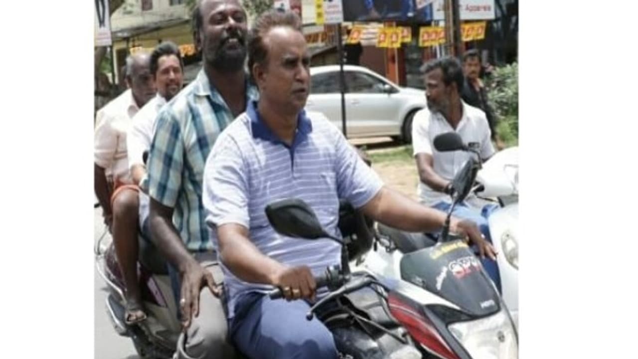 minister velumani drove the bike and wearing a t-shirt and a track pant
