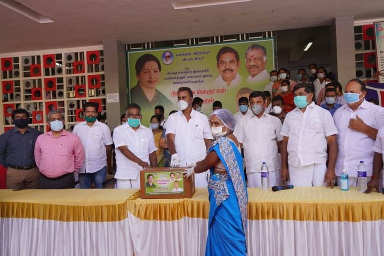 மாநகராட்சி ஊழியர்கள் 1000 பேருக்கு முழு பாதுகாப்பு கவச உடைகள் மற்றும் 7,500 துாய்மை பணியாளர்கள், செவிலியர்கள், துாய்மை காவலர், டேங்க் ஆபரேட்டர், மஸ்துார் மற்றும் காவலர்கள் என மொத்தம் 20,450 பேருக்கு நிவாரணப் பொருட்களை அமைச்சர் வேலுமணி வழங்கி உரையாற்றினார். 10 கிலோ அரிசி, பருப்பு, எண்ணெய், சோப்பு என 28 வகையான பொருட்களுடன் சுமார் 30 கோடி மதிப்பிலான நலத்திட்ட உதவிகளை வழங்கியுள்ளார்.