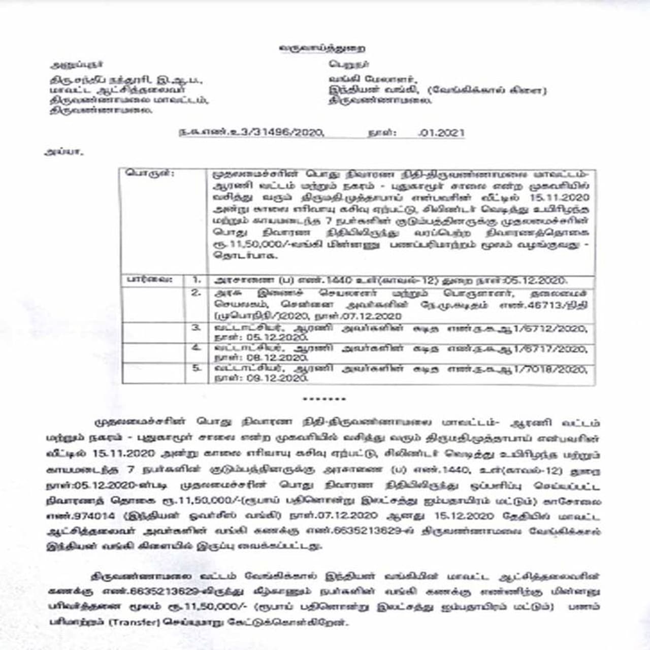 திருவண்ணாமலை மாவட்ட ஆட்சித் தலைவர் தனது வங்கி கணக்கிலிருந்து மின்னனு பரிவர்த்தனை மூலம் முத்துக்குமரனின் இந்தியன் வங்கி கணக்கிற்கு அனுப்ப பிறப்பித்த உத்தரவு சான்றாக உள்ளது. (உத்தரவு நகல் இணைக்கப்பட்டுள்ளது).