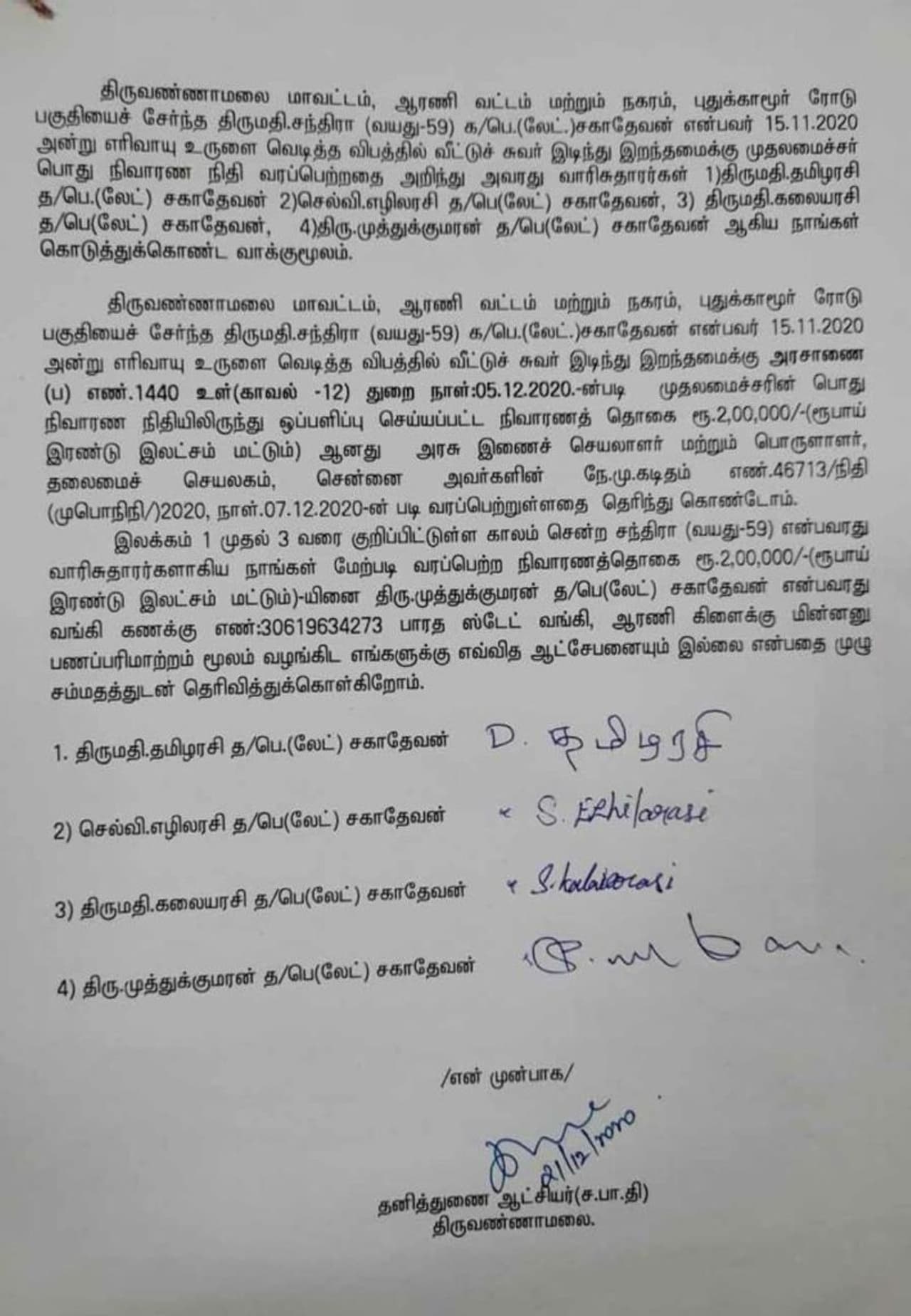 எழிலரசியின் சகோதரரான முத்துக்குமரனின் வங்கி கணக்கிற்கு நிவாரண தொகையை செலுத்த முழு சம்மதம் தெரிவித்து எழிலரசி கையொப்பமிட்டுள்ளதும் தெரியவந்துள்ளது. இறந்த சந்திராவின் மகள்கள் எழிலரசி உள்ளிட்ட மூவரும் மகன் முத்துகுமரனும் கொடுத்துள்ள வாக்குமூலத்தில் எழிலரசி ஆங்கிலத்தில் கையொப்பமிட்டுள்ளார். வாக்குமூலம் படிவமே இதற்கு சான்றாக உள்ளது. (வாக்குமூலத்தின் நகல் இணைக்கப்பட்டுள்ளது).