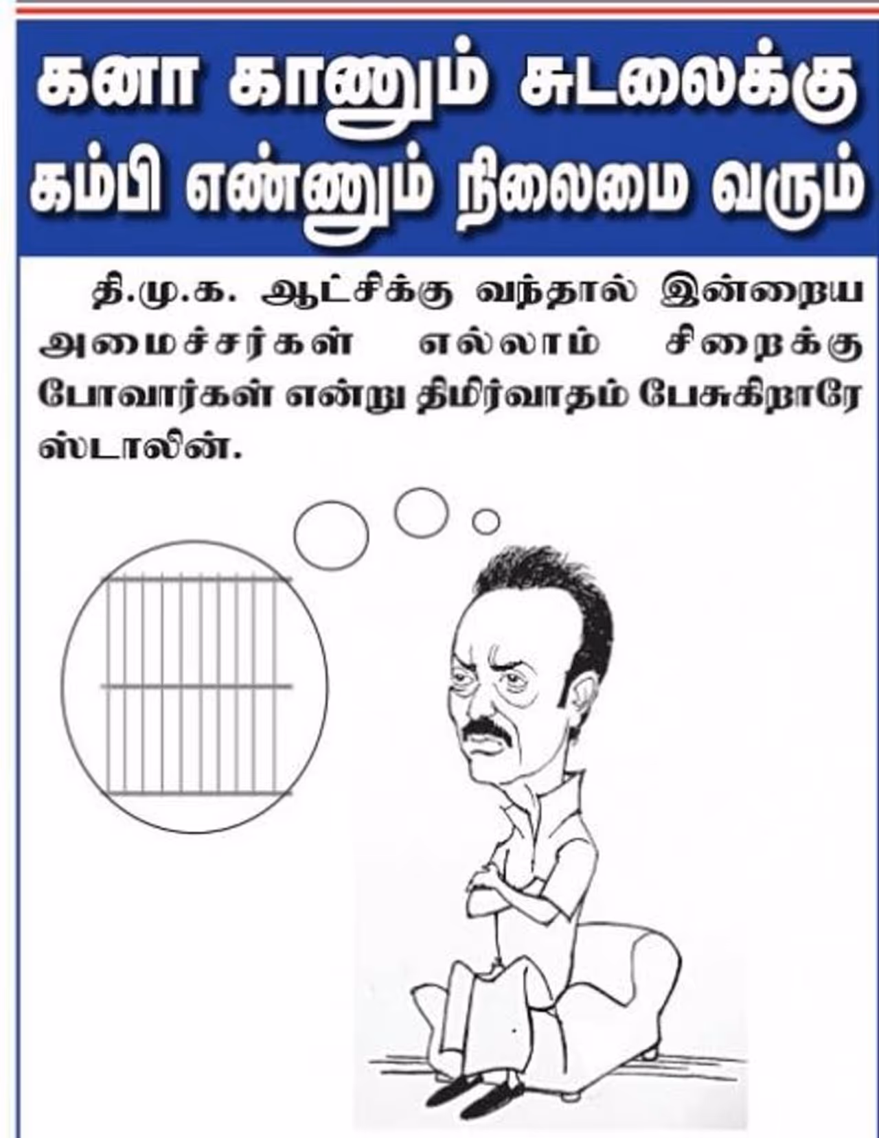 கனா காணும் சுடலைக்கு கம்பி எண்ணும் நிலைமை வரும் என்கிற தலைப்பில் கட்டுரை வெளியிட்டுள்ள நமது அம்மா நாளிதழ், ‘’திமுக ஆட்சிக்கு வந்தால் இன்றைய அமைச்சர்கல் எல்லம் சிறைக்கு போவார்கள் என்று திமிர் வாதம் பேசுகிறாரே ஸ்டாலின்.