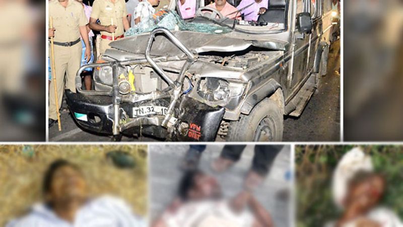 அப்போது திடீரென ஓட்டுநரின் கட்டுப்பாட்டை இழந்த ஜீப், சாலையின் வலதுபுறத்தில் சென்றது. அப்போது, விழுப்புரத்தில் இருந்து புதுச்சேரி சென்ற, 'டி.வி.எஸ்., அப்பாச்சி, ஹீரோ ஹோண்டா ஸ்பிளண்டர் பிளஸ்' பைக்குகள், சைக்கிளுடன் நின்றிருந்த மண்ணாங்கட்டி, 60, ஆகியோர் மீது மோதிய ஜீப், சாலையோர பள்ளத்தில் இறங்கியது. இந்த விபத்தில் மண்ணாங்கட்டி, மோட்டார் சைக்கிளில் வந்த பாபு (30), மற்றொரு மோட்டார் சைக்கிளில் வந்த திருமுருகன் (30) ஆகிய மூவரும் சம்பவ இடத்திலேயே உயிரிழந்தனர்.