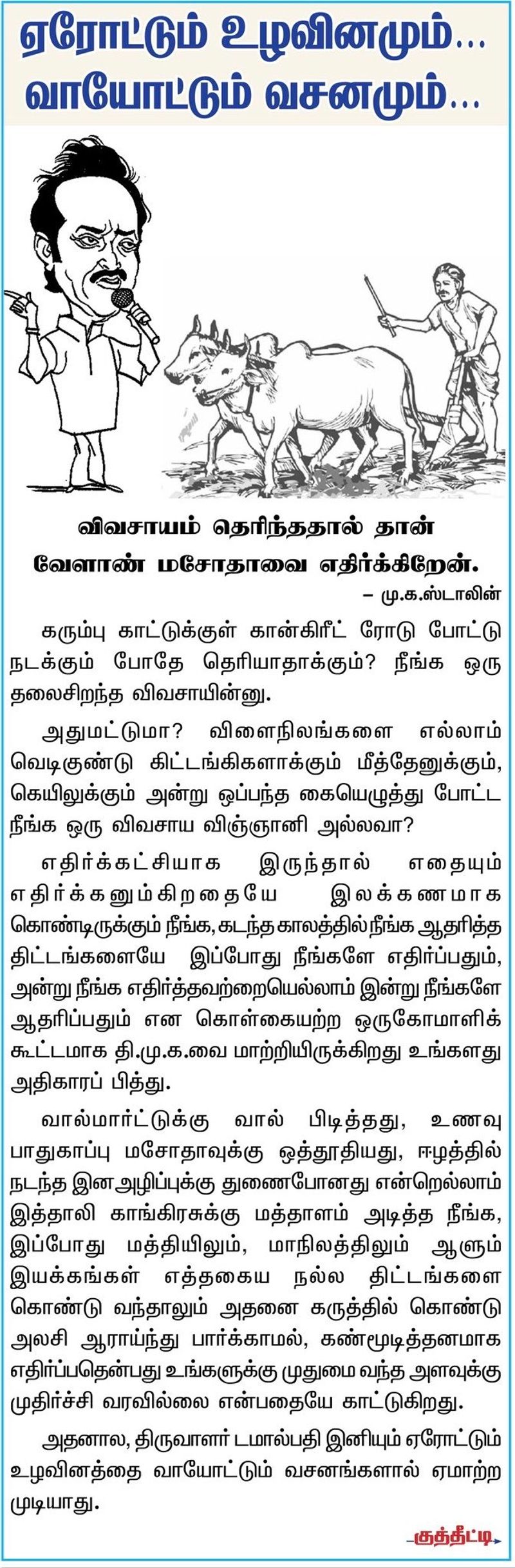 ஏரோட்டும் உழவினமும், வாயோட்டும் வசனமும் என்கிற தலைப்பில் நமது அம்மா நாளிதழில் குத்தீட்டி எழுதிய கட்டுரை ஒன்று வெளியாகி இருக்கிறது.