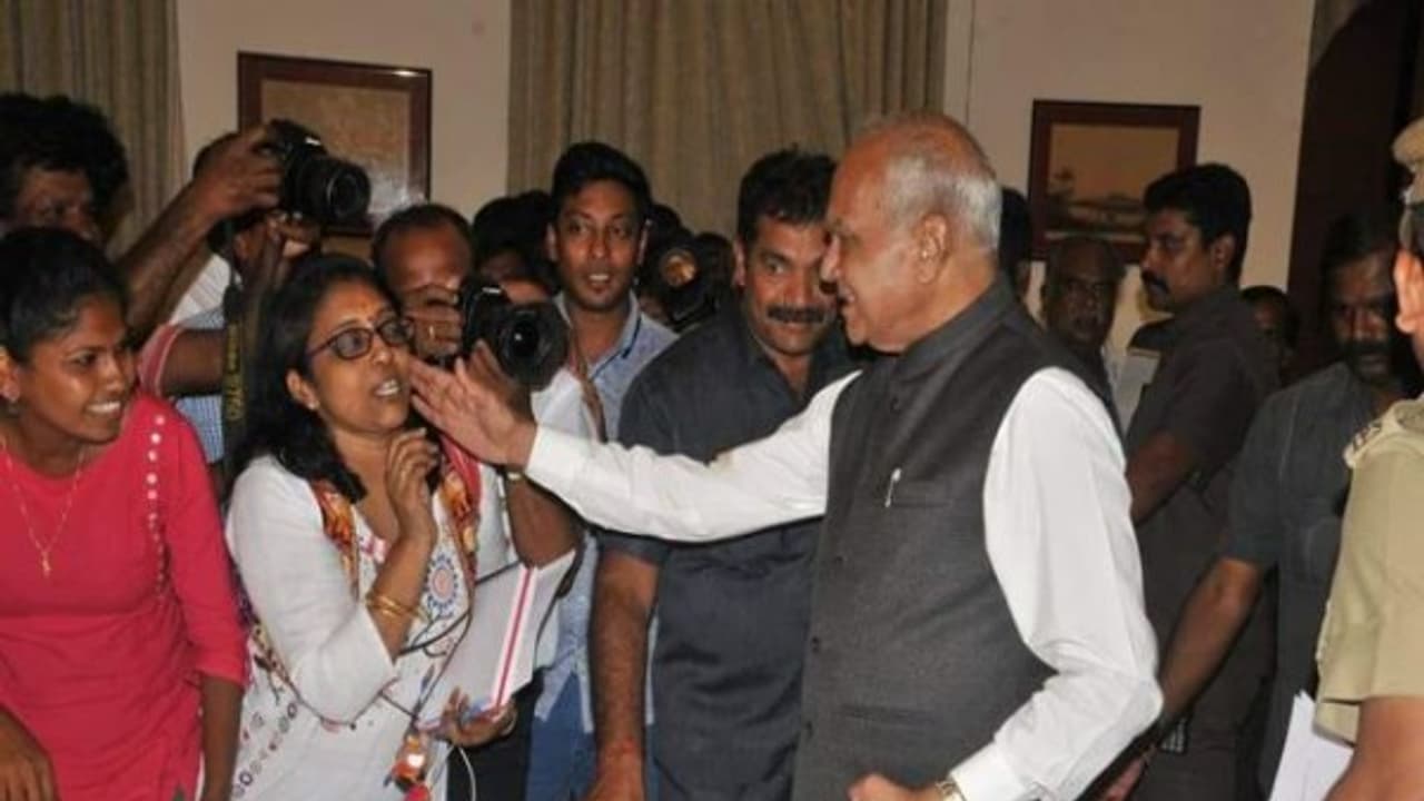 அப்போது பேசிய ஆளுநர், நிர்மலா தேவியை நான் பார்த்ததுகூட இல்லை என்றார். இந்த விவகாரம் தொடர்பாக விசாரணைக்குழு அமைக்கப்பட்டுள்ளது என்று கூறினார். செய்தியாளர்கள் உடனான சந்திப்புக்குப் பிறகு, பெண் செய்தியாளர் ஒருவரிடம் சென்ற அவர், நீ என் பேத்தி போல் உள்ளாய் என்று கூறி அவரது கன்னத்தை தடவினார். ஆளுநரின் இந்த செயல் பெண் பத்திரிகையாளர் உட்பட அங்கிருந்தவர்களை அதிர்ச்சியடைய செய்தது.
