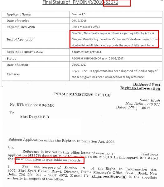 அதில், 27.1.2017 தேதியிட்ட கடிதம் மூலம் நடிகை கவுதமி எழுதிய கடிதத்துக்கு, NO INFORMATION AVAILABLE ON RECORDS என்று பிரதமர் அலுவலக அதிகாரிகள் பதிலளித்துள்ளனர். இதனால், கௌதமி கூறியது பொய்யா? என்ற சந்தேகம் எழுகிறது. .