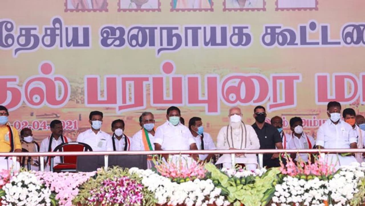 மதுரையில் நடைபெற்று வரும் தேசிய ஜனநாயக கூட்டணி பிரசார பொதுக்கூட்டத்தில் பிரதமர் மோடி முதல்வர் எடப்பாடி பழனிசாமி, துணை முதல்வர் ஓபிஎஸ் உள்ளிட்டோர் பிரசார கூட்டத்தில் பங்கேற்றனர். அப்போது, பிரதமர் மோடி பேசுகையில்;- வெற்றிவேல், வீரவேல் நீங்கள் எல்லாம் நல்லா இருக்கீங்களா? மதுரை வந்தது மிக்க மகிழ்ச்சி. தமிழ்ப்பாண்பாட்டின் முக்கிய மையமாக மதுரை திகழ்கிறது. புண்ணிய பூமியாகவும் வீர பூமியாகவும் மதுரை மண் விளங்குகிறது. தமிழர்களின் பாரம்பரிய கலாசாரத்தை பறைசாற்றும் இடமாக மதுரை திகழ்கிறது.