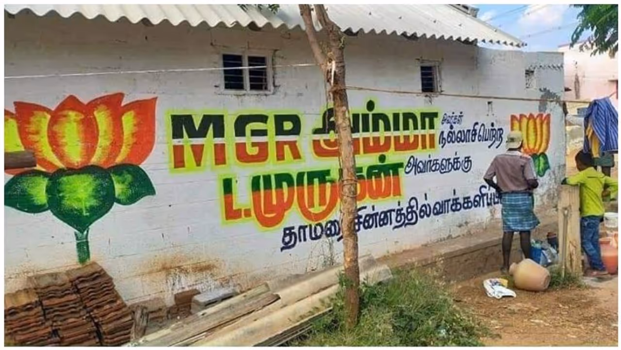 கரூர் மாவட்டம், அரவக்குறிச்சி தொகுதியில் பாஜக வேட்பாளராக, அண்ணாமலை போட்டியிடுகிறார். இவருக்கு ஆதரவாக அப்பகுதி சுவர்களில் எழுதப்பட்டிருந்த விளம்பரத்தில், தாமரை சின்னத்துடன், இதயதெய்வம் அம்மா மற்றும் பிரமதர் மோடியின் நல்லாசி பெற்ற வேட்பாளர் கே.அண்ணாமலைக்கு வாக்களிப்பீர் என எழுதப்பட்டிருந்தது.
