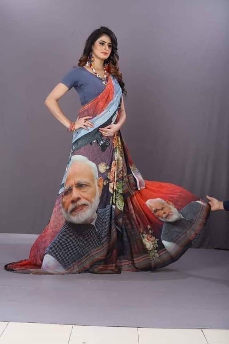 அதாவது காசி விசுவநாதர் காரிடார், அயோத்தி ராமர் கோயில், பிரதமர் மோடியின் புகைப்படம், பாஜக மற்றும் இந்துத்துவ வசனங்கள், பாஜகவின் தேர்தல் சின்னம் தாமரை போன்றவை புடவைகளில் அச்சிடப்பட்டுள்ளன. இந்தப் புடவைகள் உ.பியில் வினியோகம் செய்ய திட்டமிடப்பட்டுள்ளது. இந்த புடவைகளின் பெரும்பாலான வடிவமைப்புகள் 3D முறையில் அச்சிடப்பட்டுள்ளன. " ராமரை அழைத்து வந்தவர்களை அழைத்து வருவோம்" என்ற முழக்கங்களும் அதில் அச்சிடப்பட்டுள்ளன. மீரட், லக்னோ, கான்பூர் மற்றும் கோரக்பூரில் உள்ள புடவை ஷோரூம்களில் இத்தகைய புடவைகள் விற்பனைக்கு வந்துள்ளன. இந்தப் புடவைகள் வியாபாரிகள் மற்றும் தெரிந்தவர்கள் என அனைவருக்கும் பரிசாக அனுப்பப்படுகிறது என கான்பூரைச் சேர்ந்த புடவை வியாபாரி ராஜு என்பவர் தெரிவித்துள்ளார். மீரட்டைச் சேர்ந்த புடவை வியாபாரி ஒருவர் நாங்கள் சில மாதிரிகளை காட்டியுள்ளோம், ஆர்டர்கள் கிடைத்தவுடன் சேலைகள் அச்சிட்டு விநியோகிக்கப்படும் என கூறியுள்ளார்.