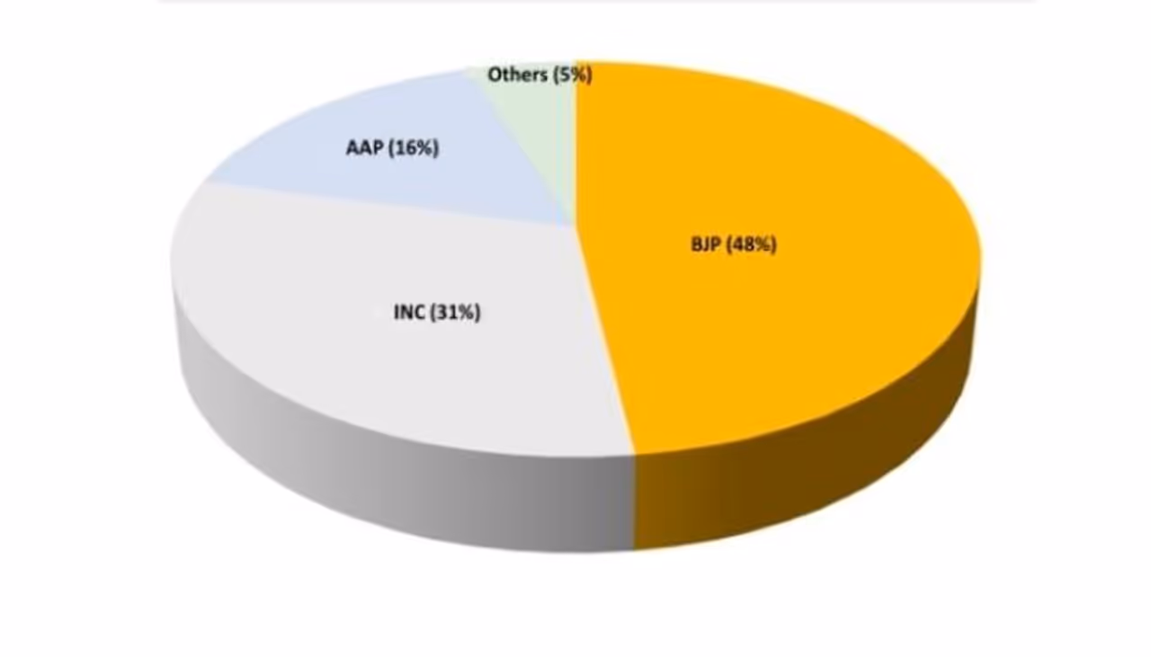 அதே நேரத்தில் காங்கிரஸ் மற்றும் ஆம் ஆத்மி முறையே 28 முதல் 37 மற்றும் 5 முதல் 14 இடங்களைப் பெறலாம். காங்கிரஸின் வாக்கு சதவீதம் 10 சதவீதம் குறைய வாய்ப்புள்ளது. அதே சமயம் பாஜகவின் வாக்கு சதவீதம் ஒரு சதவீதமும், மற்றவர்களுக்கு ஐந்து சதவீதமும் குறையும். தேர்தலுக்கு முந்தைய கருத்துக்கணிப்பு, ஆம் ஆத்மிக்கு சாதகம் இருப்பதாகவும், அதன் வாக்குப் பங்கு 16 சதவீதம் வரை உயரக்கூடும் என்றும் தெரிவிக்கிறது.