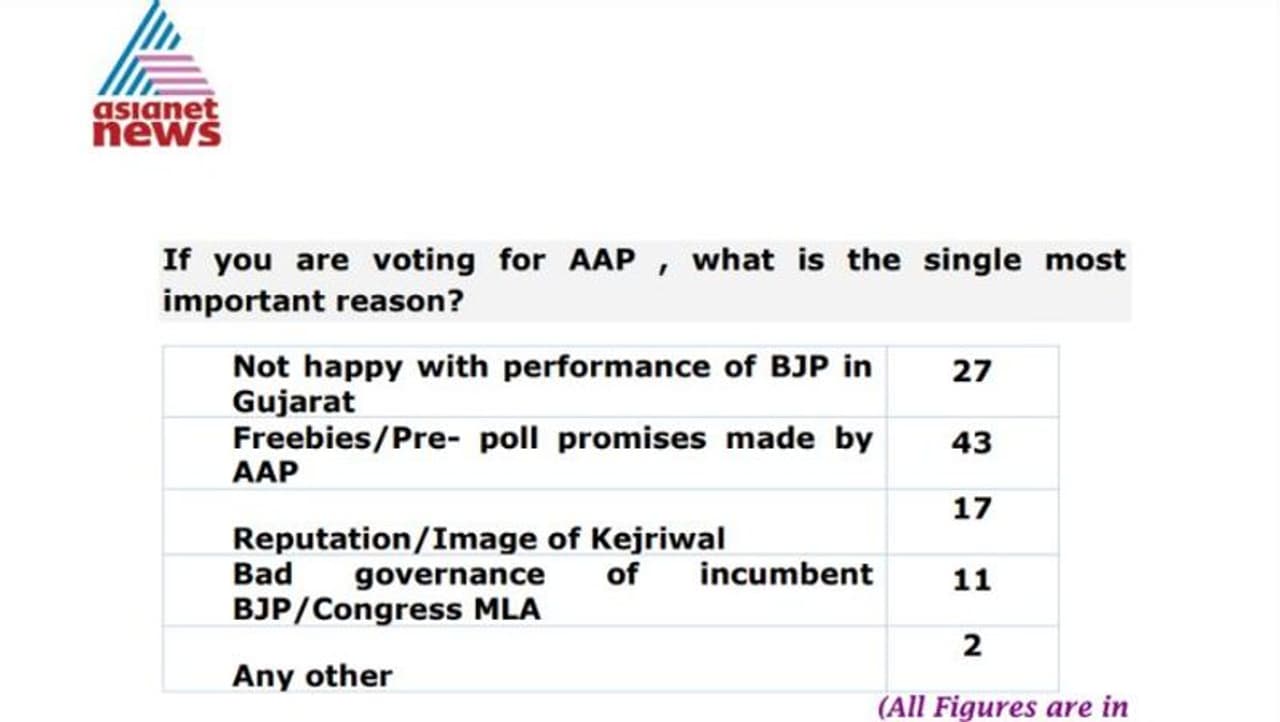 ஆம் ஆத்மி கட்சியை பொறுத்த வரையில், 43 சதவீத வாக்காளர்கள், அரவிந்த் கெஜ்ரிவால் தலைமையிலான கட்சிக்கு வாக்களிக்க ஒரே காரணம், குஜராத்தில் அவர்கள் பிரச்சாரம் செய்த போது அளித்த இலவசங்கள் மற்றும் தேர்தலுக்கு முந்தைய வாக்குறுதிகள் தான். 2017 குஜராத் தேர்தலில் பாஜக 99 இடங்களிலும், காங்கிரஸ் 77 இடங்களிலும், சுயேச்சைகள் 3 இடங்களிலும், BTP 2 இடங்களிலும், NCP 1 இடங்களிலும் வெற்றி பெற்றன என்பது குறிப்பிடத்தக்கது.