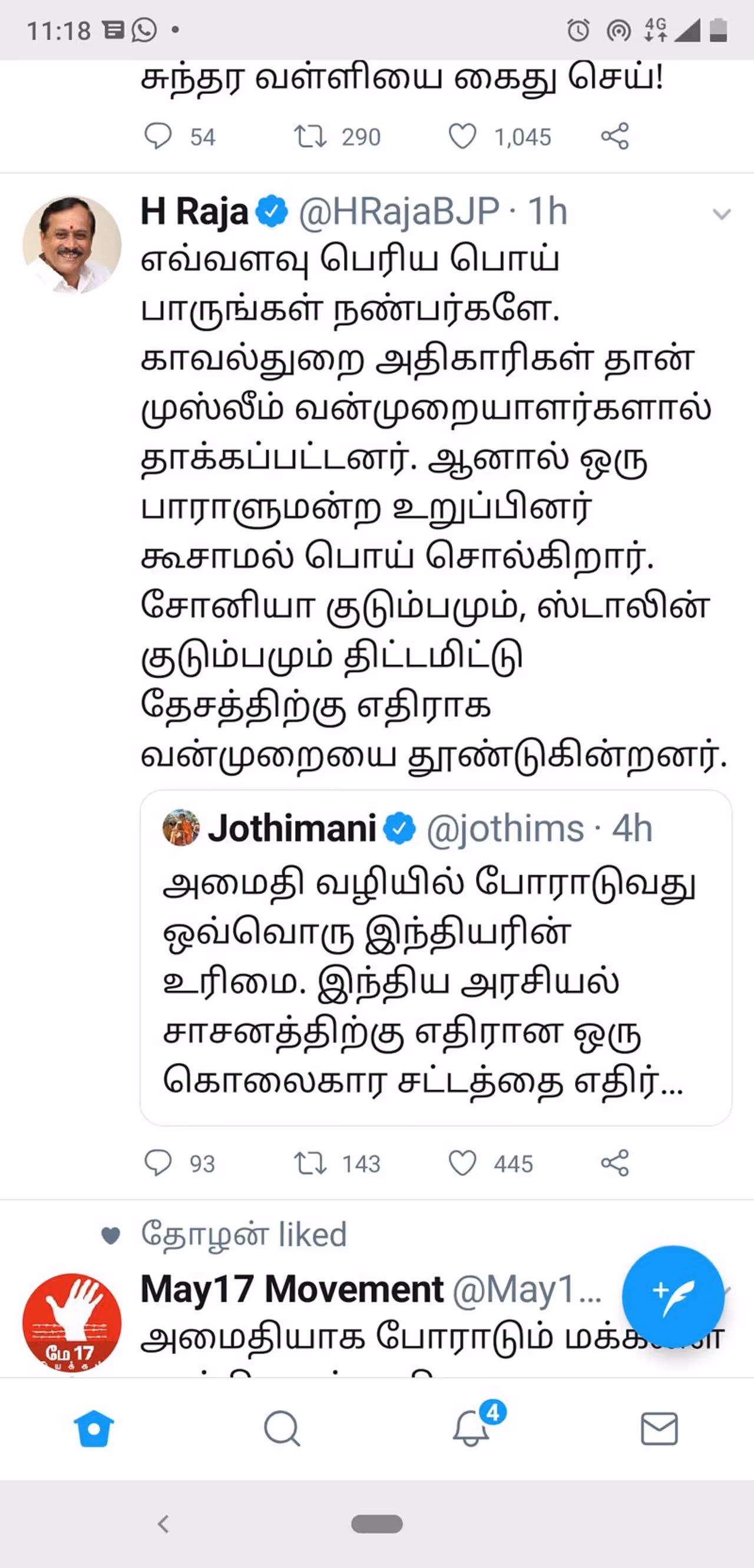 இந்த நிலையில் காங்கிரஸ் எம்பி ஜோதிமணி ட்விட்டர் பதிவில் அமைதி வழியில் போராடுவது ஒவ்வொரு இந்தியரின் உரிமை. இந்திய அரசியல் சாசனத்திற்கு எதிரான ஒரு கொலைகார வண்ணாரப்பேட்டையில் அமைதி வழியில் போராடிய இஸ்லாமிய சகோதர சகோதரிகள் மீது வன்முறையை ஏவி ஒரு உயிரைப் பறித்த பிஜேபியின் அடிமை அதிமுக அரசை கடுமையாக கண்டிக்கிறேன் என்று பதிவு செய்திருக்கிறார். அய்யோ எவ்வளவு பெரிய பொய்யை ஒரு எம்பி சொல்லுகிறார் பாருங்கள் என்று பிஜேபி தேசிய செயலர் ஹெச்.ராஜா தன் பங்கிற்கு ட்விட்டர்ல பதிவு போட்டிருக்கிறார். அதில் ‘காவல்துறை நண்பர்கள் தான் முஸ்லீம் வன்முறையாளர்களால் தாக்கப்பட்டனர். ஆனால் ஒரு பாராளுமன்ற உறுப்பினர் கூசாமல் பொய் சொல்லுகிறார். சோனியா குடும்பமும். ஸ்டாலின் குடும்பமும் திட்டமிட்டு தேசத்திற்கு எதிராக தூண்டுகின்றனர் என்று பதிவிட்டிருக்கிறார்