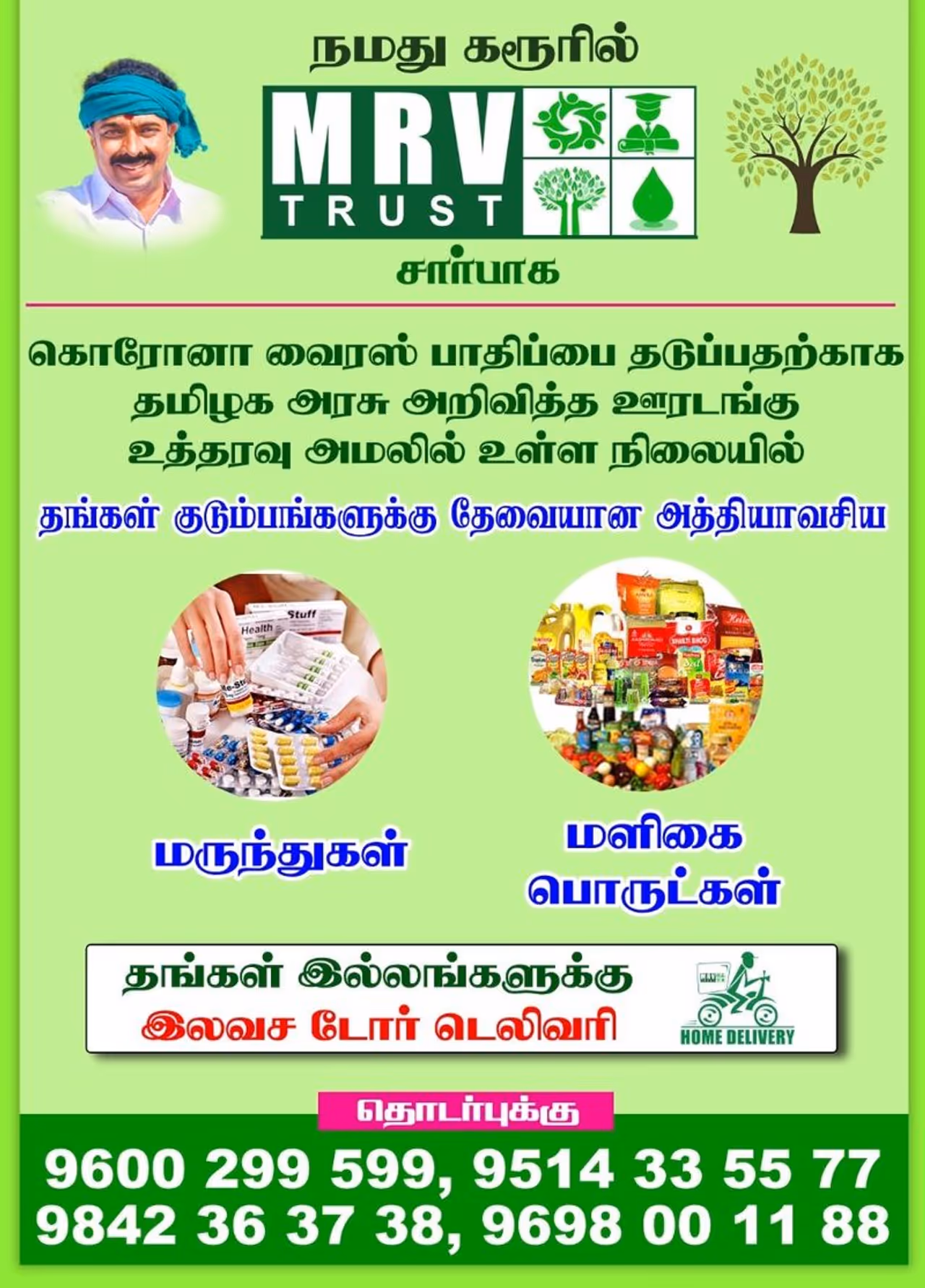 அதன் ஒரு பகுதியாக மக்களுக்கு தேவையான அத்தியாவசிய பொருட்களை ஆர்டரின் பேரில் வீடு தேடி சென்று இலவசமாக டோர் டெலிவரி செய்யும் சிறப்பு ஏற்பாட்டை செய்துள்ளனர். 144 தடை உத்தரவு அமலில் உள்ள நிலையில் பொதுமக்கள் அத்தியாவசிய பொருட்களை வாங்க வெளியே சென்றால் சமூக விலகலை கடை பிடிக்க இயலாமல் போகும் என்பதால் கரூர் மாவட்டத்தில் MRV டிரஸ்ட் சார்பாக கரூர் நகராட்சி பகுதிகளில் மளிகை பொருட்கள் மற்றும் மருந்துகளை ஆர்டரின் பேரில் இலவச டோர் டெலிவரி செய்து வருகின்றனர்.