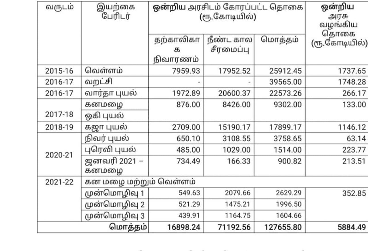 ஆக மொத்தம் 21 ஆயிரத்து 692 கோடி ரூபாய் தமிழ்நாடு அரசால் ஒன்றிய அரசிடம் கேட்கப்பட்டுள்ளது. பிரதமர் அவர்களிடம் டெல்லி சென்று மாண்புமிகு முதலமைச்சர் அவர்கள் வைத்த கோரிக்கை இது. கடந்த டிசம்பர் 19 ஆம் தேதி அன்று இந்த கோரிக்கை வைக்கப்பட்டது. கோரிக்கை வைத்து இரண்டு வாரங்கள் ஆகப் போகிறது. நிதி ஒன்றிய அமைச்சர் இங்கு வந்து பார்த்துச் சென்றார். அவரிடமும் கோரிக்கை வைக்கப்பட்டது. ஒன்றியக் குழு மூன்று நாட்கள் தங்கி ஆய்வை நடத்தியது. அவர்களிடமும் முதலமைச்சர் அவர்கள் இந்தக் கோரிக்கைகளை வைத்தார். ஆனால் இதுவரை முதலில் 450 கோடி ரூபாயும், பின்னர் 450 கோடி ரூபாயும் ஒன்றிய அரசிடம் இருந்து தரப்பட்டது. இதுவும் வழக்கமாக வரும் நிதி தானே தவிர, இப்போது ஏற்பட்ட புயல் --– மழை –- வெள்ளச் சேதங்களில் இருந்து மீட்கப்பட்ட சிறப்பு நிதி அல்ல.