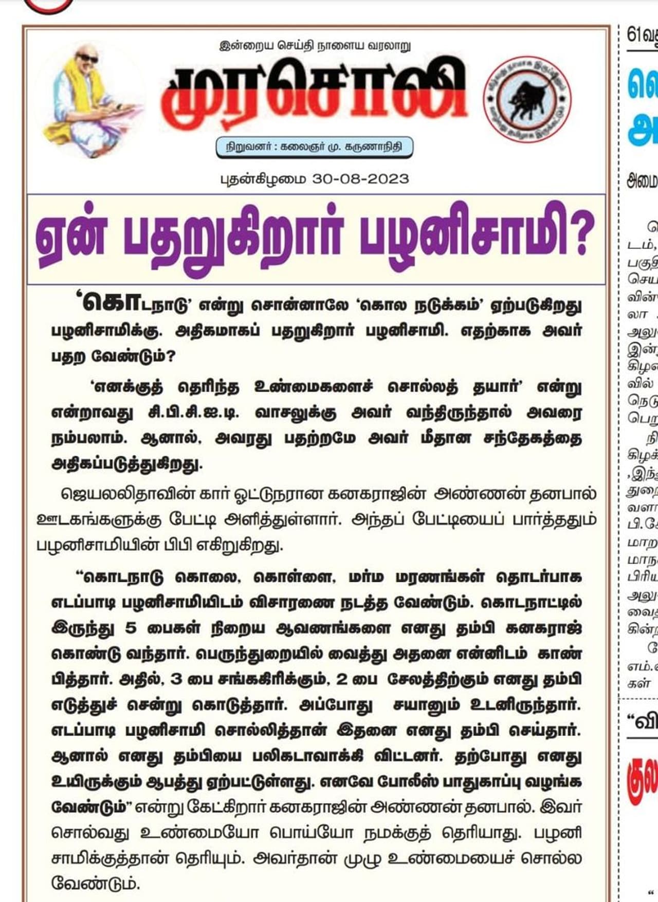 கொடநாடு கொலை வழக்கு தொடர்பாக திமுகவின் நாளேடான முரசொலியில் வெளிவந்துள்ள தலையங்கத்தில் கொடநாடு' என்று சொன்னாலே 'கொல நடுக்கம்' ஏற்படுகிறது பழனிசாமிக்கு. அதிகமாகப் பதறுகிறார் பழனிசாமி. எதற்காக அவர் பதற வேண்டும்?'எனக்குத் தெரிந்த உண்மைகளைச் சொல்லத் தயார்' என்று என்றாவது சி.பி.சி.ஐ.டி. வாசலுக்கு அவர் வந்திருந்தால் அவரை நம்பலாம். ஆனால், அவரது பதற்றமே அவர் மீதான சந்தேகத்தை அதிகப்படுத்துகிறது. ஜெயலலிதாவின் கார் ஓட்டுநரான கனகராஜின் அண்ணன் தனபால் ஊடகங்களுக்கு பேட்டி அளித்துள்ளார். அந்தப் பேட்டியைப் பார்த்ததும் பழனிசாமியின் பிபி எகிறுகிறது.