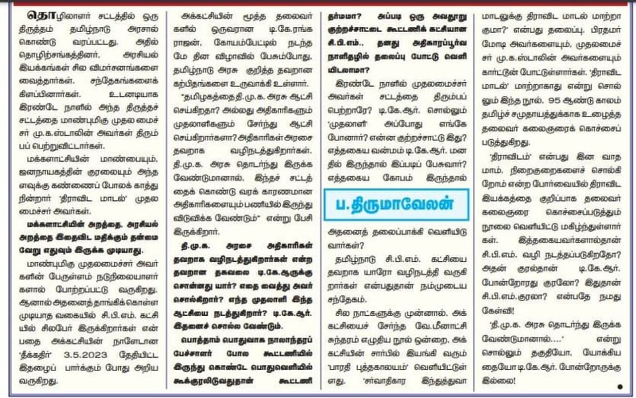 மக்களாட்சியின் மாண்பையும். ஜனநாயகத்தின் குரலையும் அந்தளவுக்கு கண்ணைப் போலக் காத்து நின்றார் 'திராவிட மாடல்' முதலமைச்சர் அவர்கள். மக்களாட்சியின் அறத்தை, அரசியல் அறத்தை இதைவிட மதிக்கும் தன்மை வேறு எதுவும் இருக்க முடியாது. முதலமைச்சர் அவர்களின் பேருள்ளம் நடுநிலையாளர்களால் போற்றப்பட்டு வருகிறது. ஆனால் அதனைத் தாங்கிக்கொள்ள முடியாத வகையில் சி.பி.எம். கட்சியில் சிலபேர் இருக்கிறார்கள் என்பதை அக்கட்சியின் நாளேடான தீக்கதிர் 3.5.2023 தேதியிட்ட இதழைப் பார்க்கும் போது அறிய வருகிறது.