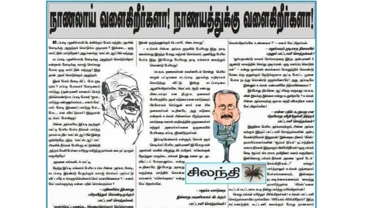 நாடாளுமன்றத் தேர்தலில் அதிமுக- பிஜேபி கூட்டணியில் பாமக இணைந்துள்ளது. இந்த நிலையில் முரசொலி நாளிதழில் நாணலாய் வளைகிறீர்களா! நாணயத்துக்கு வளைகிறீர்களா என்ற தலைப்பில் ஒரு கட்டுரை எழுதப்பட்டிருந்தது. அதில் எடப்பாடி பழனிசாமி மோடிக்கு அழுத்தம் கொடுக்கிறார் என்றால் மோடிக்கு மசாஜ் செய்வது போல என்று ஒரு கார்டூன் வந்தது.